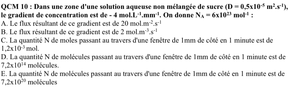 Avant toutes choses, ce que je fais c'est que je convertis les données dans les bonnes unités : ton flux doit être homogène à une quantité de matière qui passe par une surface, dans un temps donné, rien qu'avec ça tu as un résultat qui doit être en moles (ou tu peux mettre en molécules) par des mètre carrés par des secondes, donc d'entrée la B est FAUSSE.