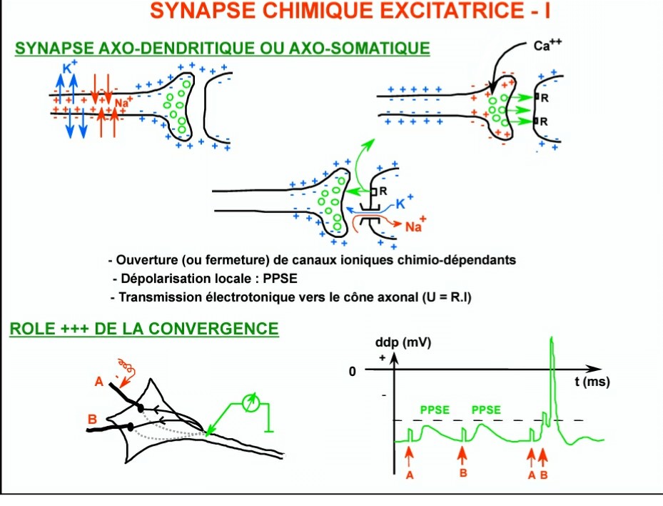 jujulalipoprot Posted February 5, 2018 Posted February 5, 2018 (edited) Saluuut J'ai du mal à voir la difference de ces 2 diapos, mis à part que pour l'une c'est excitatrice et l'autre inhibitrice... Du coup : - excitatrice : '' ouverture ou fermeture de canaux ioniques '' c'est ok, depolarisation donne PPSE c'est ok, pour le rôle de la convergence j'ai retenu que 2 PPSE infra liminaires peuvent se sommer et donner un PA, c'est ça ou il y autre chose ? - inhibitrice : '' ouverture de canaux ioniques '' ici ce n'est pas écrit ''ou fermeture'' c'est normal ?! On parle plus de depolarisation avec PPSE mais d'hyperpolarisation avec PPSI, et pour la congruence il faut comprendre pareil ? À savoir que 2 PPSI infra peuvent se sommer et donner un PA ? Voilà c'est un peu le foutoir dans ma tête, merci d'avance !! Edited February 5, 2018 by jujulalipoprot Quote