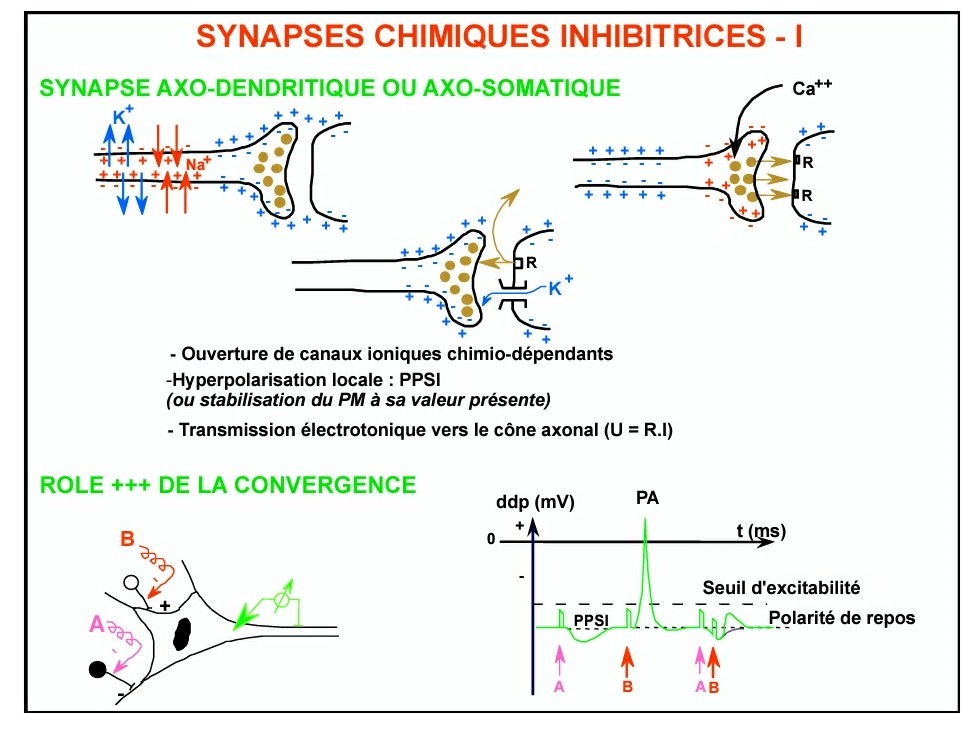 Samiot Posted February 5, 2018 Posted February 5, 2018 Olaaaa ! Pour la synapse activatrice tu as tout compris Quant à la synapse inhibitrice on doit surement te parler d'ouverture simplement parce que la synapse inhibitrice majoritaire fonctionne en activant un canal chlore qui va faire rentrer du chlore dans la cellule qui crée une hyperpolarisation et donc une inactivation de la cellule. J'imagine qu'il dit ça car il n'y a pas d'autres exemple mais je ne suis pas 100% sur de moi sur ce coup là ! Ensuite non 2 PPSI ne vont pas créer un PA puisqu'ils sont inhibiteurs donc il peuvent au mieux augmenter l'hyperpolarisation et donc encore plus inactiver le neurone. Quote