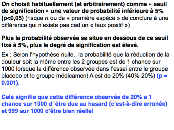 Gardinatops Posted April 17, 2018 Posted April 17, 2018 Salut P est le degré de signification, c'est a dire la probabilité de ne pas avoir de difference significative si je me souviens bien... Donc si il est tres inférieur a 0.05, il y a peu de chance que les deux groupes comparésconfirment l'hypothèse nulle, donc au seuil de 5% on peut dire que la difference est significative... Tu vois? Je sais pas si je suis tres claire, n'hesite pas sinon !! Je complète un ptit peu : - p<0.05 : différence statistiquement significative, on rejette Ho - p> 0.05 : différence non significative, on ne peut pas rejeter Ho, mais on ne "l'accepte" pas cependant. Quote