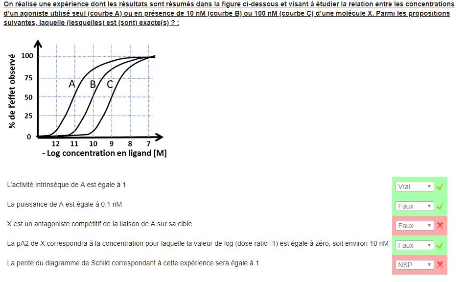 HadjDh Posted April 22, 2018 Posted April 22, 2018 il y a 8 minutes, AdrienM a dit : je suis désolé je ne comprends pas non plus A moins de tracer la courbe et de faire une résolution graphique (construire le diagramme de Schild), ce qui serait trop long lors du concours, je ne vois pas comment le calculer... @HadjDh il me semblait que c'était la dose ratio qui était égale à 2 quand le pA2 est atteint, pas log(dose ratio -1), ce qui est logique car quand dose ratio =2 , cela équivaut à CE50 de l'agoniste en présence d'antagoniste = 2 * CE50 de l'agoniste en l'absence d'antagoniste Je suis un peu perdu haha Dans son cours on peut voir que la Dose Ratio = 2 tu l'utilise que dans un diagramme de Schild (le QCM qui vient juste après celui que notre ami en haut nous met) De ce que je viens de comprendre à l'instant le Pr Senard a calculer le log (dose ratio - 1) pour chaque Agonise et Antagoniste et a ensuite tracer un Diagramme de Schild pour nous donner le PA2 (qui vient également après le QCM que l'ami a mis) Mais c'est vraiment super long comme tu dis ! Mais dans ce cas, l'item ne demande pas de chercher le pA2 non ? Parce-que la réponse est 100 nM Quote