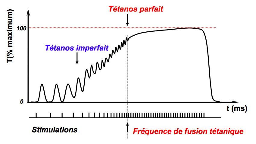 Solution Clémentine Posted April 26, 2018 Solution Posted April 26, 2018 Hello ! En fait lorsqu'une contraction est tétanique c'est que les PA sont à une fréquence exacte pour laquelle les tensions de chaque PA vont se sommer jusqu'a donner une tension maximale !! C'est au tétanos parfait qu'on a une tension tétanique ! Pour de ce qui est la valeur de 2 à 3 fois qu'on vous donne en fait regarde sur le schéma la tension développée avec 1 PA (c'est la premiere "vague") si tu la somme 2 à 3 fois en hauteur (genre tu prends la vague, tu ajoutes pile au dessus la même vague et encore une fois) et bien tu arrives à la tension du tétanos parfait !! Pour arriver a cette tension il faut une certaine fréquence des PA comme je disais plus haut, cette fréquence dépend des muscles (certains auront besoin de PA très rapprochés pour arriver au tétanos parfait et d'autres des PA plus éloignés). Tu n'as pas à connaitre cette fréquence. Voila ! Quote