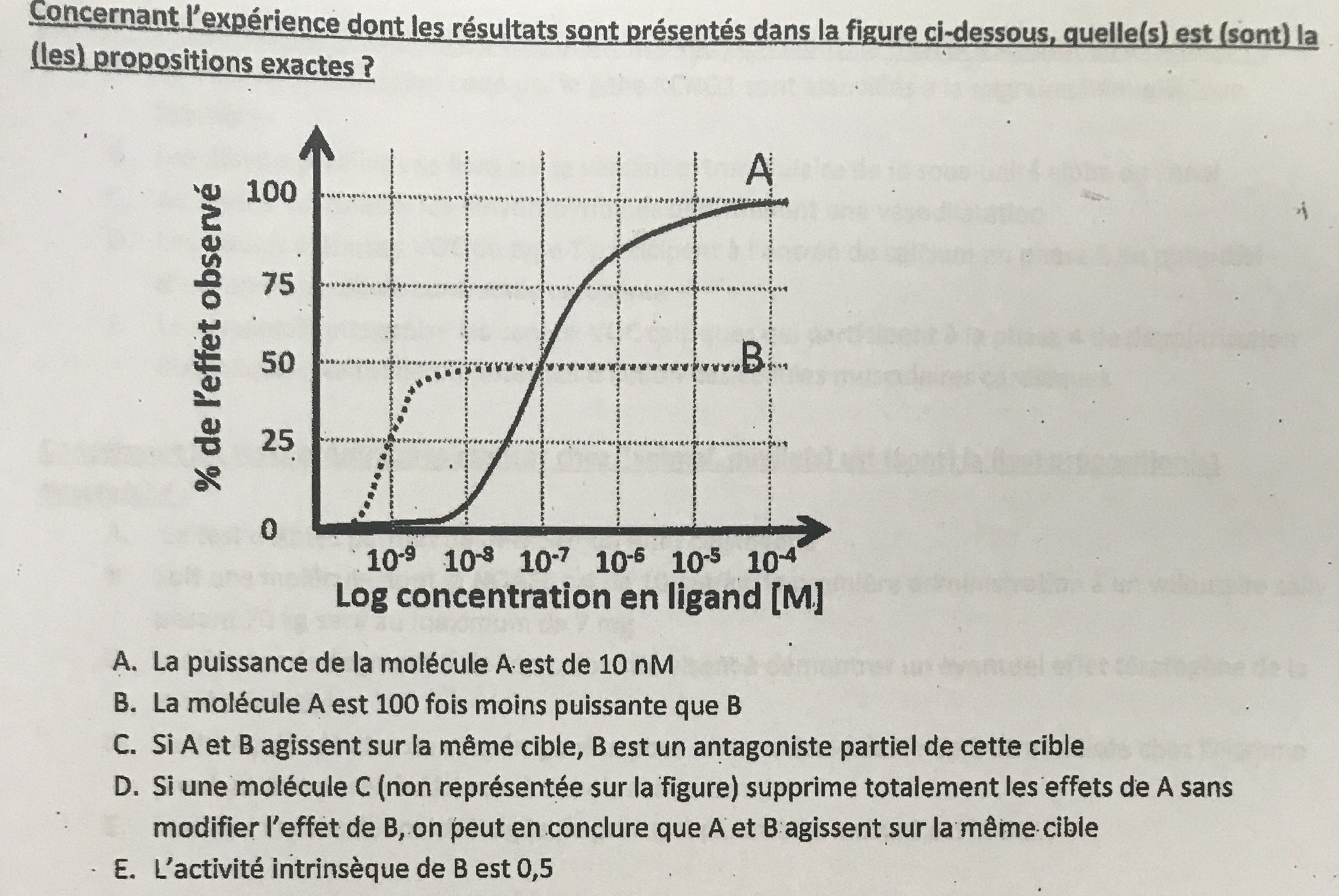 Solution Gardinatops Posted April 26, 2018 Solution Posted April 26, 2018 il y a 15 minutes, Guibanez a dit : Oui oui @Porthos je suis complément d’accord avec @HadjDh agoniste partiel = antagoniste partiel Juste je reviens sur un truc du coup pour @rbm2322a c’est 10^-8 nM plutôt pour B pour avoir 100 fois plus puissant que A qui est à 10^-7 non ? Si on suit la méthode de @pépé98 pour la B : tu prends la courbe B, tu regardes la moitié de ses effets (donc à 25% ici) et tu tombes bien sur 10^-9, donc bien 100 fois moins puissant ! c'est clair pour toi ? Quote
