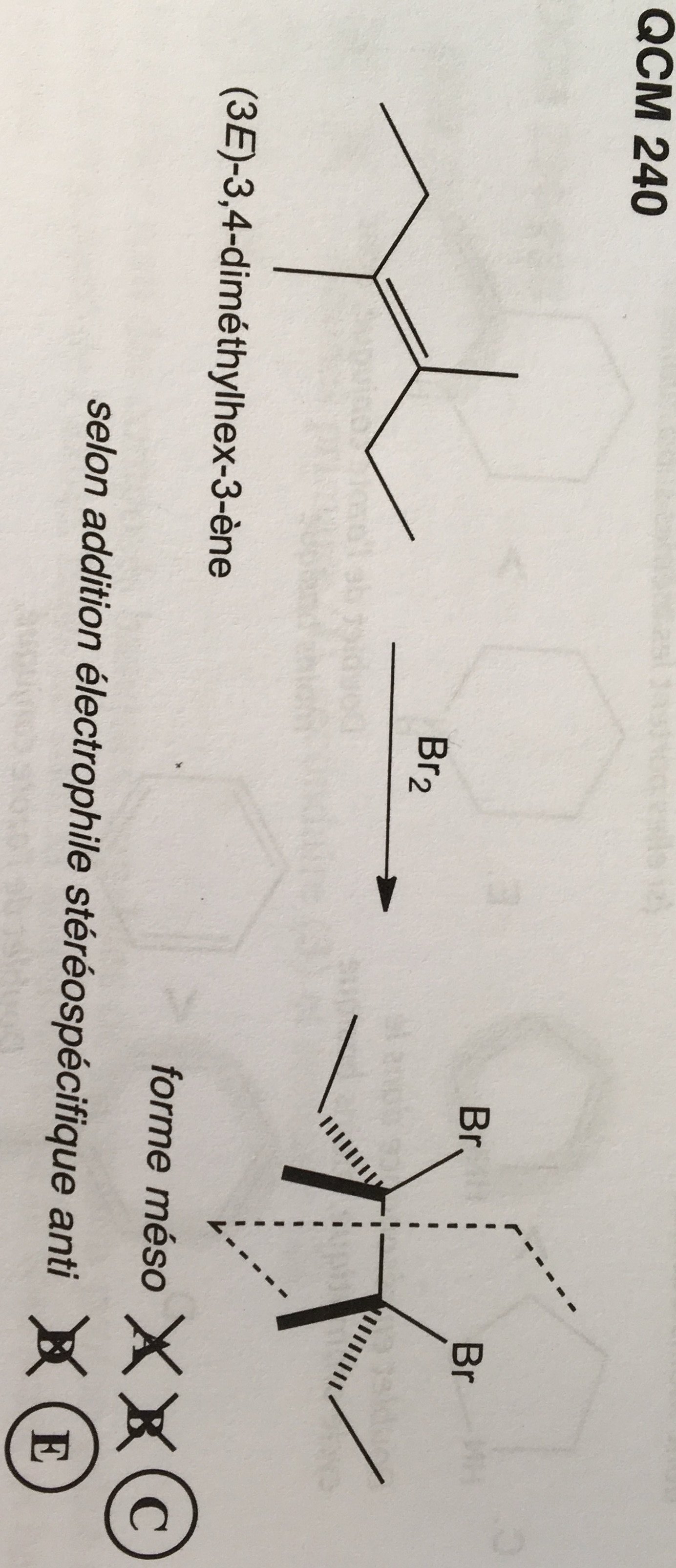 Ancien Responsable Matière Scorpio Posted September 7, 2018 Ancien Responsable Matière Posted September 7, 2018 Salut @chloe2948, tu peux mettre en photo le QCM et la correction ? il y a 32 minutes, chloe2948 a dit : Bonjour, Dans le livre de la prof, le QCM240 parle de la réaction du fibrome sur le 3,4-diméthylhex-3-ène de configuration E. Mais dans la correction détaillée, ils représentent la molécule obtenue ayant les deux bromes du même côté, or une dihalogénation est une réaction trans spécifique. Quelqu'un pour m'expliquer ? Quote