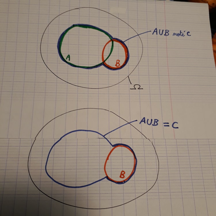Nibus Posted September 11, 2018 Posted September 11, 2018 @Scorpio, je ne vois pas ce qui pose problème. J'ai noté C l'événement AUB qui est l'union (et non pas l'intersection) de A et de B, point. Maintenant si tu veux connaître la probabilité de AUB c'est bien : P(AUB) = P(C) = P(A) + P(B) - P(A∩B) Mais P(B∩C) est bien égal à P(B), regarde mon schéma si tu ne comprends pas. Quote
