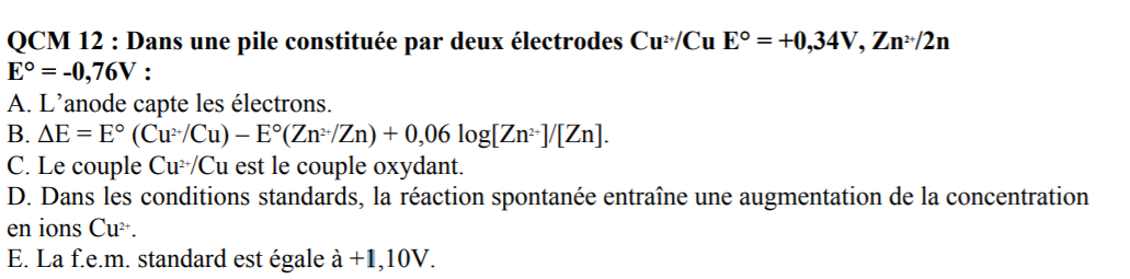 MasterOfTricheliade Posted October 5, 2018 Posted October 5, 2018 Bonjour, bonsoir a tous! j'ai quelques problèmes concernant des QCM du pack de polys de cette année. a l'item B compté faux ( et je suis d'accord), dans la correction il est dit que la formule est : je ne comprend tout simplement pas d'ou vient le log[Zn2+]/[Zn] ! pour moi c'est plutot log[Cu2+]/[Zn] ( en utilisant la formule: DE=DE0+0,059/2* log[Cu2+]/[Zn2+] =DE0 Ma deuxieme question concerne le QCM16 je n'arrive pas à trouver pourquoi l'ethanol est reducteur et non oxydant ( cf correction) je trouve que le Mn2+ est oxydant( il peut gagner des electrons), et que donc le CH3-COOH doit etre reducteur. ce qui veut dire que l'ethanol est oxydant et que MnO4- est reducteur... Merci d'avance de vos reponses ! Purpanement votre. Quote