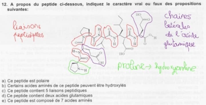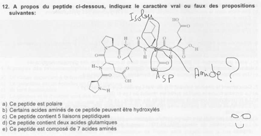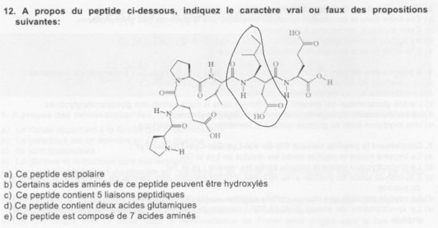 Solution Reïner Posted October 17, 2018 Solution Posted October 17, 2018 Salut Parolier974 ! Pour ce peptide: ITEM A----> -On peut déduire qu'il est polaire grâce à la présence de 3 fonctions carboxyles ITEM B----> -L'acide aminé proline peut être hydroxylé, c'est le cas dans la triple hélice de collagène où l'hydroxyproline orientée vers l'extérieur ,stabilise la triple hélice par interactions hydrophobes ITEM C----> -La liaison peptidique se forme par condensation d'une fonction amine et d'une fonction carboxyle et sera identifiable après réaction par la liaison H-N-C=O ( partie rigide de la liaison peptidique ) . Sur l'image on peut effectivement compter 5 liaisons peptidiques! ITEM E----> -A partir de l'item C , on peut affirmer qu'il y a 6 acides aminés( car 5 liaisons peptidiques) et non pas 7 comme le nombre de chaines latérales semble nous l'indiquer . Le piège vient du fait que les chaines latérales de l'acide aspartique et de l'isoleucine se situent sur le même acide aminé ( deuxième en partant de la droite) et ne participe en conséquence qu'à la formation d'un seul acide aminé ! ITEM D----> Ce peptide contient bien deux acides glutamiques ( la chaine latérale carboxylée restante correspond à la celle d' un acide aspartique et même si ça avait été la chaine latérale d'un acide carboxylique on n'aurait pas pu le compter du fait de la présence de la chaine latérale de l'isoleucine sur le même acide aminé) En espérant avoir répondu à ta question ! Quote