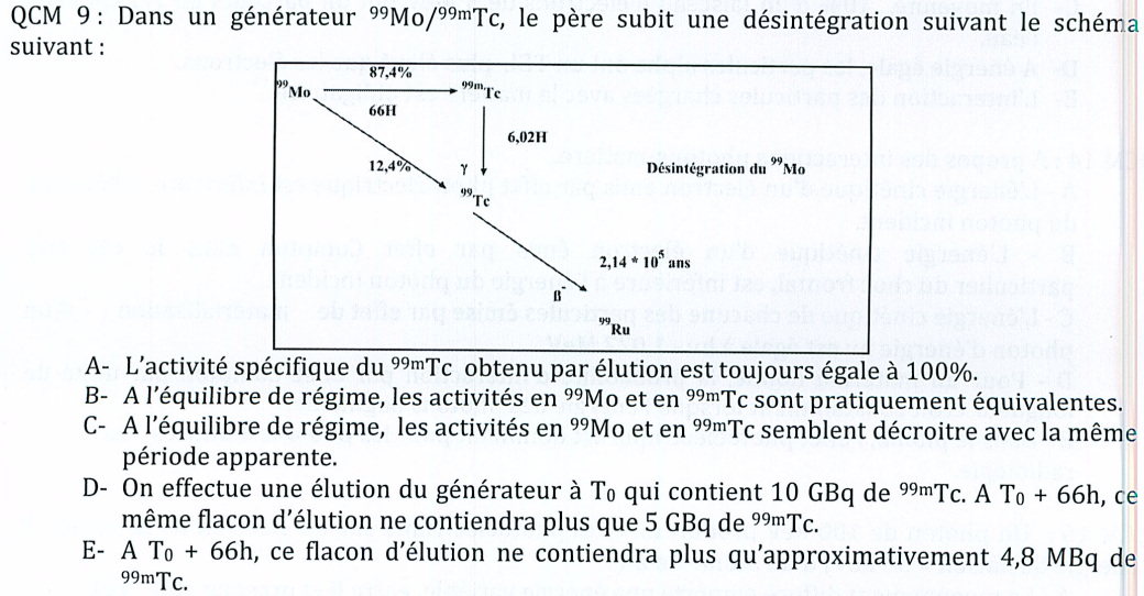KDoubleRotor Posted October 20, 2018 Posted October 20, 2018 Bonsoir, concernant ce QCM, du concours blanc 2015-2016 de Maraîchers, je pense qu'il y a une erreur à la correction des deux derniers item à moins que j'ai rien compris à la filiation radioactive. La correction à la fin marque que B,C E sont vrai Or on a bien un équilibre de régime entre 99Mo et 99mTc, donc 99mTc devrait se désintégrer avec la période du père (donc 66h) Donc on a D vrai, et E faux non ? Quote