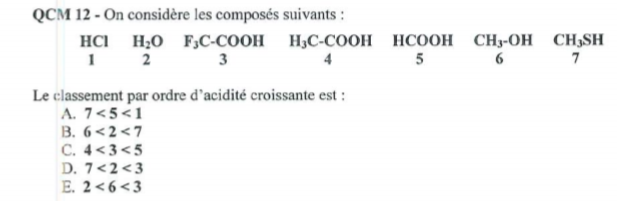 Solution ncm Posted November 6, 2018 Solution Posted November 6, 2018 Salut! alors pour ce qui est de ta première question (D): au niveau des formes mésomères tu as un problème de charge tu as un plus à droite et un moins à gauche c'est pour ca que c'est faux, dans une forme mésomère le nombre de charge doit toujours être conservé 13C Ici l'azote va être lié à 3 carbones or l'azote peut faire 4 liaisons donc il va se retrouver avec un doublet non liant. ce doublet non liants va pouvoir donner des électrons, il a une donc un effet mésomère donneur et non attracteur ensuite pour ce qui est des acidités: HCl est toujours le plus acide c'est l'acide chlorhydrique) ensuite ce qu'il faut savoir par coeur : par ordre du plus acide au moins acide acide (comme HCl)> acide carboxylique> thiol > eau > alcool donc dans ton exercice ici: le plus acide est donc le 1 ensuite il y a les acides carboxylique donc 3, 4 et 5 qu'il va falloir classer le 3 contient un fluor ( qui est très électronégatif) ce sera donc le plus acide. ensuite le 4 contient un groupement méthyl qui stabilise et apporte de la basicité, il est donc moins acide que la 5 donc on a 3>5>4 ensuite tu vas avoir le thiol (7) l'eau (2) et l'alcool (6) le classement par ordre décroissant est donc: 1>3>5>4>7>2>6 donc pour résumer sur la technique: tu classe en fonction de tes groupements: acide comme HCl> acide carboxylique> thiol > eau > alcool ensuite tu classe au sein de chaque groupement (par exemple si comme la tu as plusieurs acide carboxylique ou plusieur alcools...): au plus tu as de groupement électronégatif (F, Cl, O...) au plus c'est acide au plus la chaine carbonné est longue au plus c'est stable donc au plus c'est basique= du coup l'acidité diminue voila! j'espere que je suis claire en tout cas si tu as d'autre question n'hésite pas! Quote