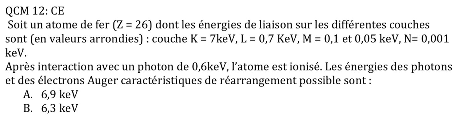 Solution Kirua Posted December 13, 2018 Solution Posted December 13, 2018 Salut, svp mettez systématiquement les références complètes des ccm (année, fac...) ça va plus vite pour nous Ici (cf. photo) seules les couches M1, M2 et N sont ionisantes. L'énoncé te dit qu'on s'intéresse aux photons et e- Auger spécifiques de réarrangement. Donc on regarde ce qui se passe quand les couches M1 et M2 sont ionisées. Tu as des réarrangements électroniques de N vers M1, N vers M2 et M1 vers M2. Les photons X de réarrangement peuvent prendre les valeurs 0,05 et 0,049 donc C et E vrais. Pour les Auger, ils seront libérés par des photons d'énergie 0,049, 0,05 ou 0,099 (là aussi cf. photo), tu auras des Auger d'énergie cinétique 0,049 depuis M2 ou N. C'est plus clair ? Quote