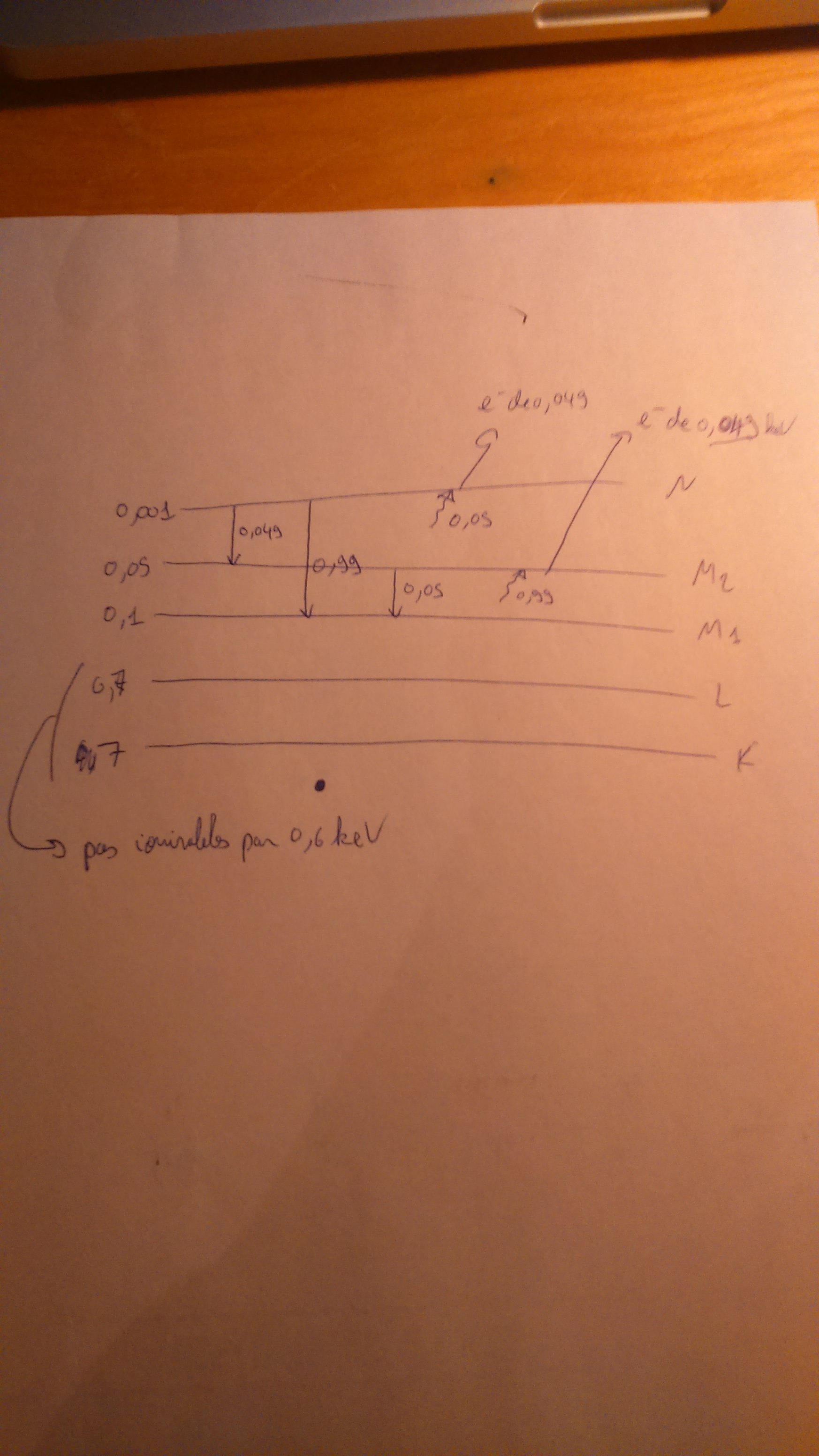 carla31 Posted December 12, 2018 Posted December 12, 2018 Salut ju06, Alors pour faire simple, pour trouver les énergies des photons de réarrangement tu dois calculer la différence entre deux couches, soit par exemple M-M2 = 0.1-0.05 = 0.05 keV, ou M-N = 0.05-0.001=0.049 keV Pour les électrons Auger, tu dois faire la différence entre l'énergie de liaison de l'électron sur sa couche et l'énergie du photon incident, soit par exemple : 0.6-0.1 = 0.5 keV Evidemment pour éjecter un électron de sa couche, ton photon doit avoir une énergie supérieure ou égale à l'énergie de liaison ! Voilà dis moi si c'est plus clair pour toi ! Quote