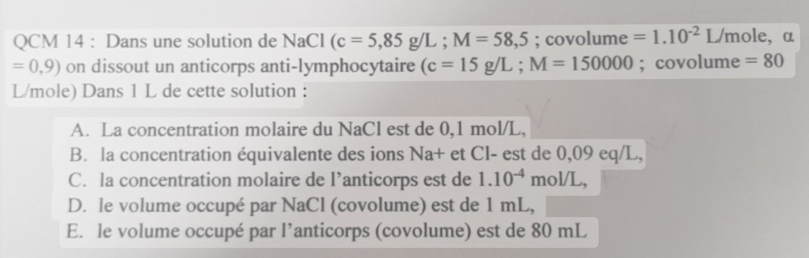 Kermit Posted December 17, 2018 Posted December 17, 2018 salut je mets ma méthode mais ya pas moyen d'avoir les items vrai pour être sûr? A. c NaCl = cm/M = 5,85/58,5 = 0,1 mol/L. OK c'est vrai B. Concentration équivalente : c'est m x p x z avec m la molarité, p le nb de particules libérés et z la charge. À priori, on doit intégrer le ⍺ au niveau du nb de particules libérées donc ça donne 0,1 x 0,9 x 1 = 0,09 eq/L pour Na+ et pareil pour Cl-. donc ok C. c AC = cm / M = 15 / 150 000 = 15 / 15 . 104 = 10-4 mol/L donc ok Le covolume c'est le volume qu'occupe les molécules par le simple fait de leur présence. Moi je fais un produit en croix basique. 1 mol de la molécule → b de covolume on a n nombre de mol de molécule, du coup on cherche notre covolume en faisant nxb/1 D. Covolume NaCl : 0,01 L pour 1 mol, or on a 0,1 mol/L de concentration, et un 1L de solution donc 0,1 mol de NaCl donc 0,001 L de covolume ça donne 1 ml, donc c'est ok. E. Covolume de l'AC : 80L pour 1 mol, on a 0,0001 mol donc 0,008L donc 8 ml du coup non à confirmer Quote
