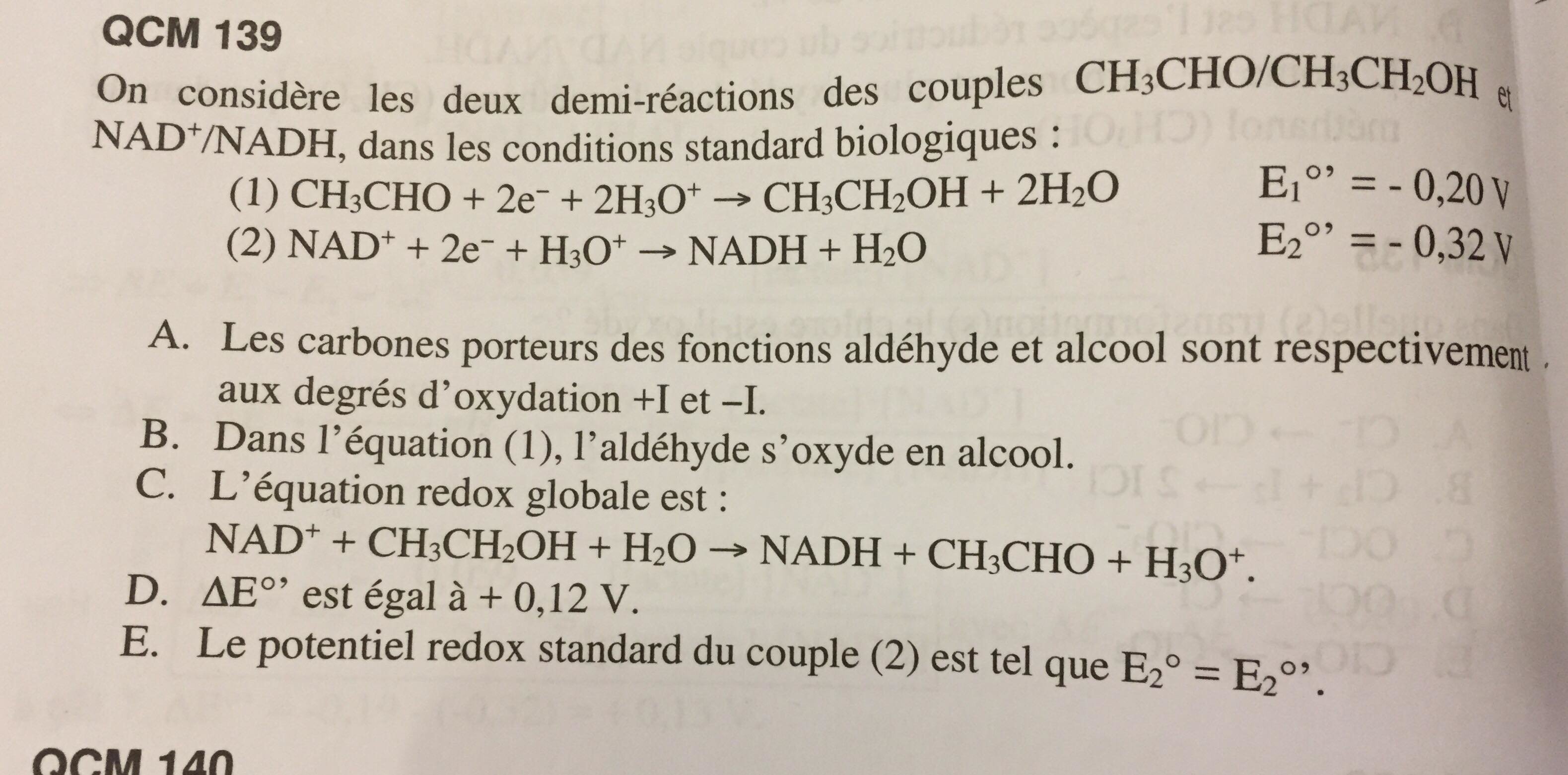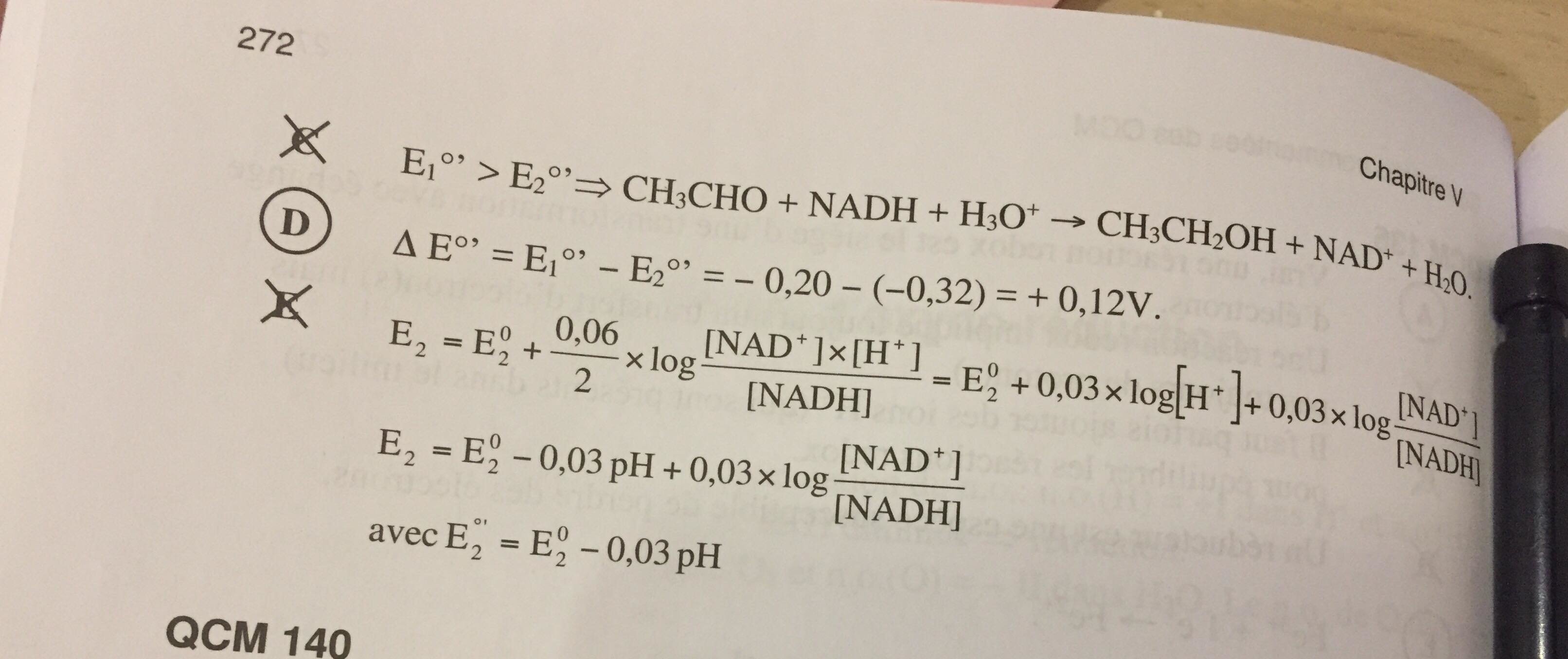 MamyLaPoudre Posted December 21, 2018 Posted December 21, 2018 Bonjour, je voulais savoir si vous pourriez m'aider à comprendre la correction de l'item E du qcm 139 du livre de la prof voilà le qcm et sa correction Enfaite je ne comprend pas à partir de E2 = E 02 - 0.03 pH + ... Quote