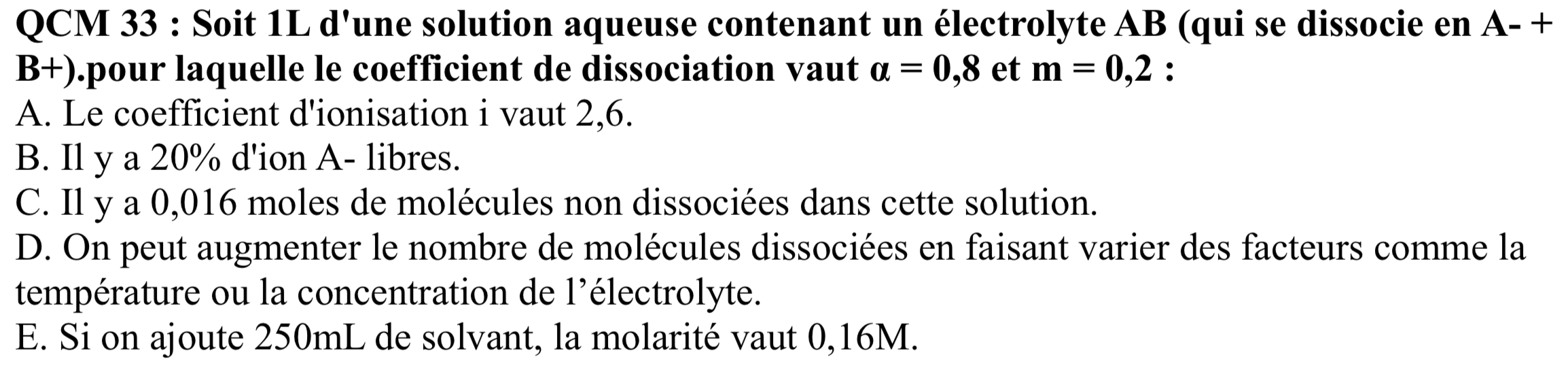 Ancien Responsable Matière Claro Posted December 26, 2018 Ancien Responsable Matière Posted December 26, 2018 Bonjour j'ai un petit soucis avec un QCM du tutorat que je n'arrive pas à comprendre que voici: Les questions justes sont BCDE, j'ai réussi à répondre à la A et la D mais pour les trois autres je ne comprends vraiment pas comment faire La B me semblait fausse en plus de cela parce qu'il me semblait que justement le coefficient de dissociation évoquait la quantité de matière dissociée et j'aurai donc dit qu'il y avait 80% de A- libres... Donc voilà je n'ai absolument pas compris la démarche à suivre pour les questions B, C et E, et dans la correction il n'y a aucune justification... Donc si quelqu'un à un peu de temps à consacrer pour m'expliquer rapidement je suis preneuse Merci d'avance ! Quote