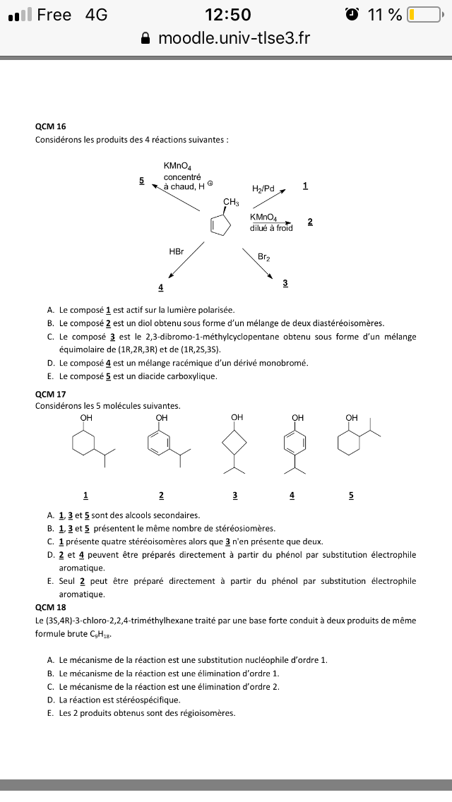 Solution Chat_du_Cheshire Posted December 27, 2018 Solution Posted December 27, 2018 On te dit que c'est une base forte donc déjà c'est forcément élimination et pas substitution (= base faible diluée). Ensuite on te dit qu'on obtient 2 formules produits de même formule brute, et tu sais que E1 donne 2 produits de même formule brute (50%E et 50%Z) alors que E2 est stéréospécifique et ne donne qu'un produit. Dac ? Quote