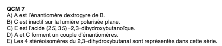 elisacc Posted December 29, 2018 Posted December 29, 2018 et pour la 7 avec mes configurations je trouve bien E de vrai! et rien à faire je tourne dans tous les sens et je trouve bien B SR et C RS, donc je comprends pas pourquoi elles ne sont pas énantiomères étant donné que c'est bien les même molécules, pas de composé méso, configuration inverse, et mêmes en les représentants en Fisher, je trouve les mêmes configurations et elles sont bien énantiomères... Quote