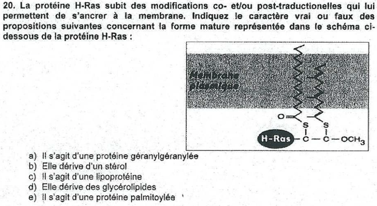 Ancien du Bureau AlyssaD Posted January 4, 2019 Ancien du Bureau Posted January 4, 2019 Bonsoir @gabrielclz, Dans le tableau de correction disponible sur la librairie à la fin du sujet 2011 la 20 E est comptée vraie. Sinon les protéolipides dans ton cours ce sont les protéines acylées/prénylées tandis que les lipoprotéines ce sont les chylomicrons, LDL, HDL etc... Bonne soirée Quote