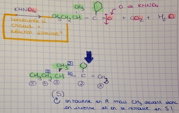 Ancien Responsable Matière Solution Liliputienne Posted January 7, 2019 Ancien Responsable Matière Solution Posted January 7, 2019 Tu es bien motivé à faire de la chimie organique à une heure pareille ! Voilà un schéma rien que pour toi (trop de chance quoi) En réalité la réaction est une réaction d'élimination puisque tu l'énoncé te parle de "concentré à chaud". Ainsi ton KMNO4 va venir couper ta molécule de départ. Comme je te l'ai indiqué tous les atomes d'O du KNMO4 sont en flux rose, ce qui prouve que lorsqu'il y a eu une coupure, ton KMNO4 a "laissé" un O à la place de ce qu'il y avait avant. De plus tu vois que les autres produits sont du CO2 et de l'H2O, ce qui veut dire que tu avais 1C et 2H qui étaient liés initialement. Ce qui fait que le CH2 fait initialement lié à ton C où se trouve le O. Si tu ne comprends pas quoique ce soit n'hésite pas, c'est compliqué de comprendre un mécanisme juste en lisant des phrases Quote