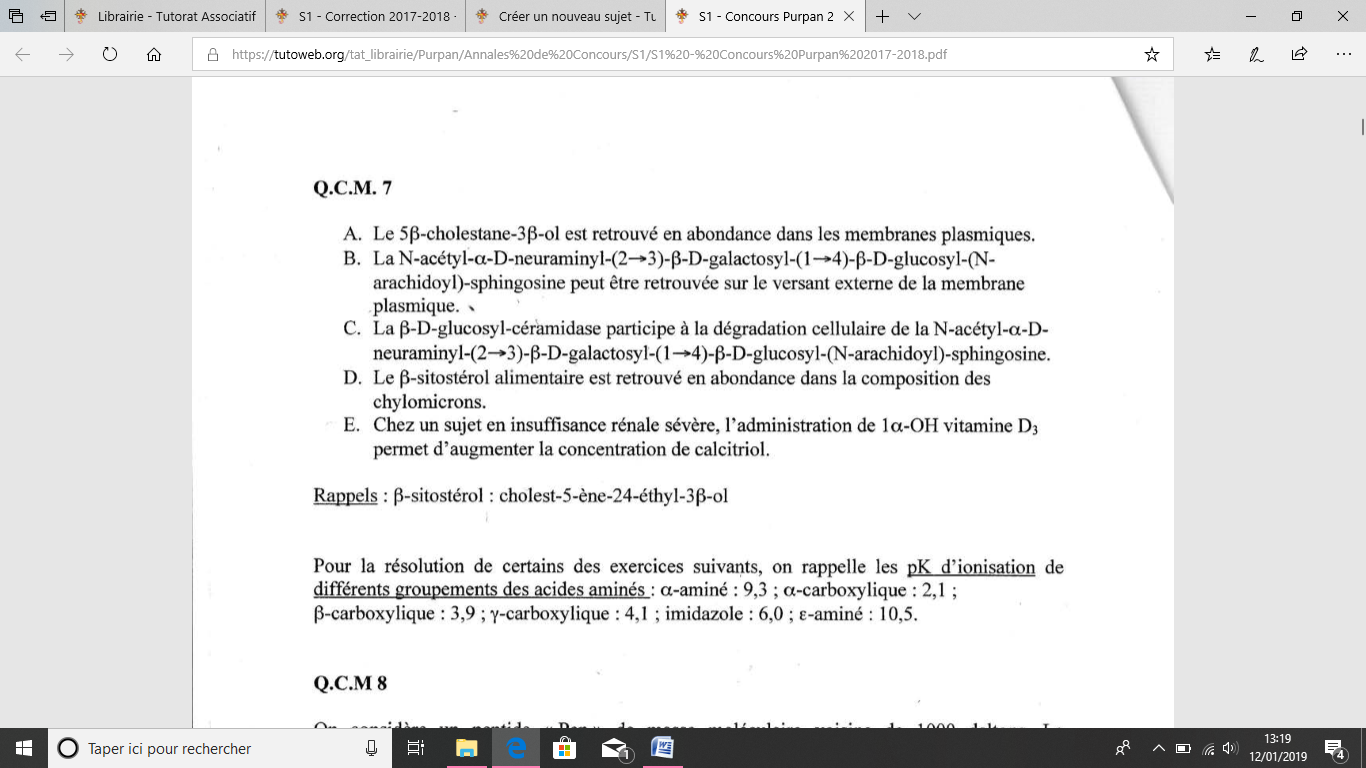 Ancien Responsable Matière Solution ValentineMartel Posted January 12, 2019 Ancien Responsable Matière Solution Posted January 12, 2019 Salut, Pour la B : Tu vois que ta molécule est formée d'un céramide (N-arachidoyl-sphingosine ici) et d'un ensemble d'oses, c'est donc un glycolipide. Les glycolipides sont retrouvés exclusivement sur le feuillet externe de la MP. Pour la C : En fait on te donne une enzyme et tu dois déterminer où elle va couper. Une -D-glucosyl-céramidase va couper entre un -D-glucose et un céramide. On te propose comme molécule un glycolipide. Les glycolipides ont formés à partir d'une céramide et d'un ou plusieurs oses. Un céramide c'est une sphingosine portant un acide gras en position "N". Donc ici, l'item est vrai car ton enzyme va pouvoir couper entre le céramide (ici N-arachidoyl-sphingosine) et le -D-glucose. N'hésite pas si qqchose n'est pas clair Quote
