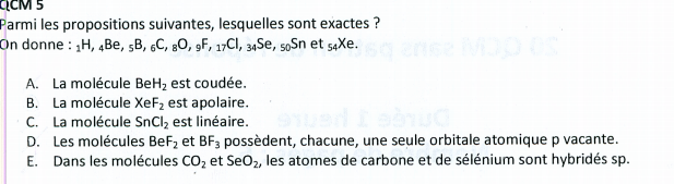 Solution Chat_du_Cheshire Posted January 13, 2019 Solution Posted January 13, 2019 Chalut Xe : ns2np6 soit II II II II qui donne après hybridation II II II I I F : ns2np5 soit II II II I On a donc XeF2 avec 3 doublets non liants sur Xe, soit AX2E3, qui est linéaire, donc apolaire Quote