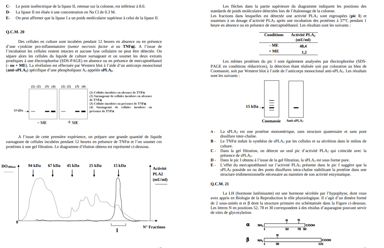 clara3107 Posted April 25, 2019 Posted April 25, 2019 Salut! J'ai plusieurs questions sur des items que je ne comprends pas trop.. Dans le poly d'entrainement du prof, cet item est compté faux : "l'EGF transfère des groupements Y-P sur des protéines membranaires" Est-ce que c'est faux car : - il ne transfère pas les groupements Y-P mais il phosphoryle ? - c'est sur les protéines cellulaires et non pas membranaires ? - pour ces deux raisons ? - pour une autre raison ? Merci Ensuite pour le QCM 20 dont j'ai joint l'énoncé, l'item E est vrai mais je ne comprends pas comment la protéine peut posséder des ponts disulfure sachant qu'avec ou sans ME, elle fait 15kDa... Dans le poly du TAT, cet item est compté juste : "L'immunotransfert peut vous permettre, à partir d'extraits protéiques endothéliaux de déterminer le poids moléculaire apparent de chacune des trois enzymes présentes dans l'endothélium." , mais ce n'est pas plutôt un gel filtration qui permet de voir le poids apparent ? Encore dans le poly du TAT, cet item est compté juste : "On peut pour cela faire une immunoprécipitation en faisait passer le sérum du patient dans une colonne avec des billes de sépharose sur lesquelles est fixée la protéine RTP (temp.)" : il ne devrait pas être compté faux car la technique décrite est la chromatographie d'affinité et pas une immunoprécipitation ? Merci beaucoup d'avance à la personne qui pourra m'aider!! (et désolée si ces questions ont déjà été traitées...) Quote