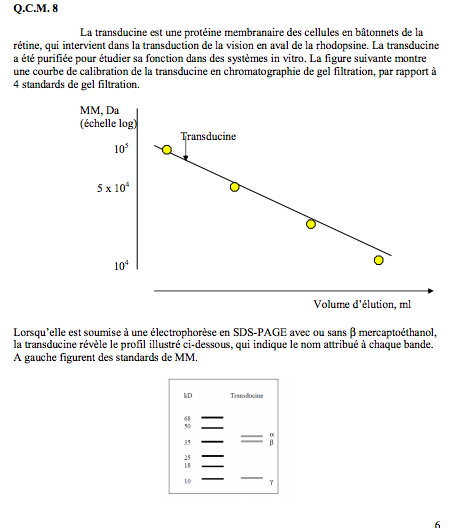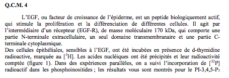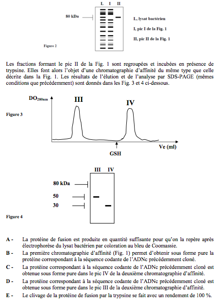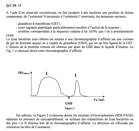Ancien Responsable Matière Solution SeverusRogue Posted April 30, 2019 Ancien Responsable Matière Solution Posted April 30, 2019 Salut, alors je viens juste de faire le 13 donc je vais répondre pour celui-ci : A : on te parle de lysat bactérien avec Bleu de Coomassie, on utilise donc les figures 1 et 2. Chromatographie d'affinité, donc c'est le 2ème pic de la figure 1 qui t'intéresse (puisque c'est celui qui contient la GST+ADNc). Tu vois dans la figure 2, que dans le lysat bactérien (1ère colonne) il y a bien le 80kDa du pic II (3ème colonne), donc la protéine de fusion est bien repérée dans le lysat bactérien. B : là on te dit que tu obtiens la protéine correspondant à l'ADNc mais attention, tu obtiens la protéine de fusion contenant l'ADNc C/D : en utilisant la trypsine, tu sépares la GST et l'ADNc, donc comme l'ADNc aura moins d'affinité pour la GSH que la GST, il sera élué en 1er -> pic III E : si le rendement n'avait pas été de 100% pour la trypsine, tu aurais eu une bande à 80kDa sur la figure 4 si j'ai pas été assez clair, hésites pas ! Quote
