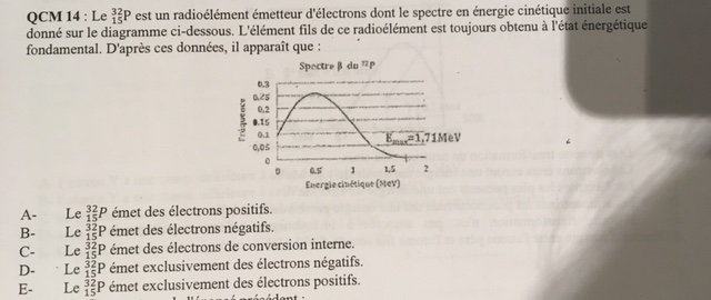 Solution Neïla Posted September 20, 2019 Solution Posted September 20, 2019 Tu vois que ton spectre est un spectre d'émission ß et qu'on n'observe pas de seuil entre l'axe des ordonnés et le début de ton sprecte, ce qui signifie qu'il s'agit d'une émission ß - il y a 12 minutes, ms987 a dit : pour la C, peut être car le fils est à l'état fondamental...? c'est exact ! les électrons de conversions internes ne sont observés que lorsqu'il y a désexcitation du noyau fils qui serait à l'état excité Pour ton item D : Une émission ß- est accompagnée de l'émission d'un électron négatif et d'un anti-neutrino ! J'espère que ça t'aide Quote