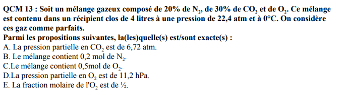 Ancien Responsable Matière Solution Téo Posted September 24, 2019 Ancien Responsable Matière Solution Posted September 24, 2019 Salut ! Il faut que tu utilises la formule PV=nRT Tu cherches n le nombre de moles : n=PV/RT Pour le CO2 par exemple : On te dit que tu en as 30% dans le mélange de 22,4 atm donc sa pression partielle = 0,3x22,4=6,72 du coup tu as la pression, tu as le volume car le volume c’est 0,3x4=1,2 donc tu peux appliquer la formule A savoir : RT à 0 degrés est une constante et vaut toujours 22,4 Si c’est pas clair tu me dis Quote