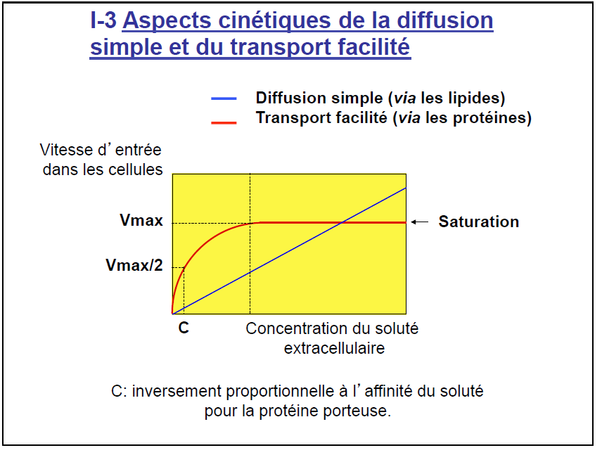 Solution Shik Posted October 4, 2019 Solution Posted October 4, 2019 Salut ! Cette phrase semble en effet étrange ! Certes le professeur précise dans son cours que la vitesse de diffusion est très importante pour les petites molécules hydrophobes et non chargé contrairement aux grosses molécules et aux ions (en citant le coefficient de perméabilité) mais je ne pense pas qu'il ait distingué les différences de transport en fonction de la masse, de cette manière. En plus les solutés de masse moléculaire élevée ne peuvent pas passer par diffusion simple. Je pense qu'il manque le contexte de concentration. Si tu as écris cette phrase lorsqu'il a montré cette diapo : On pourrait en retenir cette phrase : "Généralement, pour les solutés de faible concentration moléculaire, on a une vitesse d’entrée plus importante pour les solutés utilisant le transport facilité que pour ceux utilisant la diffusion simple et inversement pour les solutés de concentration moléculaire élevée." En effet à une faible concentration moléculaire, lorsque les transporteurs ne sont pas encore saturé, ils seront plus efficaces pour le passage d'un soluté au travers de la membrane plasmique car le passage du soluté sera sélectif; il n'y aura pas de déplacement aléatoire de la molécule pour passer la membrane, comme on le retrouve lors de la diffusion simple, la vitesse sera du coup plus importante. A forte concentration moléculaire, les transporteurs seront saturés, ils ne pourront faire passer plus de molécule à travers la membrane plasmique de manière sélectif, tandis que la diffusion simple si, puisqu'il y a une infinité de possibilité de passage. J'espère ne pas avoir répondu à coté, dis moi ce que tu en penses et si ce n'est pas clair ! Bon courage, bonne journée ! Quote