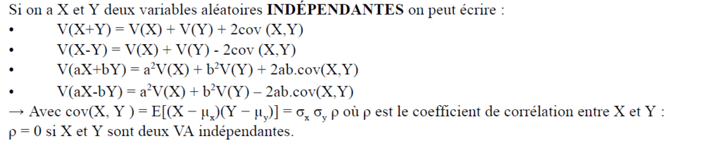 Solution JadeTR Posted October 11, 2019 Solution Posted October 11, 2019 Bonjour, Effectivement les 4 formules sont applicables même si X et Y ne sont pas indépendantes. ( mais aussi si elles le sont) Cependant, si X et Y sont indépendantes alors cov (X;Y) = 0 (mais la réciproque est fausse) et le coefficient de corrélation est égale à 0. Comme le précise la phrase en dessous qui ne concerne QUE des variables aléatoires INDEPENDANTES. J'espère que c'est plus explicite, Bon courage ! Quote