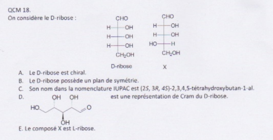 Solution maech Posted October 28, 2019 Solution Posted October 28, 2019 Salut,  Dans ton D-ribose, si tu regardes la configuration de chacuns de tes atomes tu vois qu'ils sont tous R, or dans l'énoncé ils sont tous S car lorsque le plus gros (le plus lourd) substituants est en arrière tu dois inverser donc tu vois que les atomes sont (de gauche a droite) S-S-S et dans ta correction ils sont bien tus R. Tu ne dois pas oublier d'inverser lorsque le plus gros substituant est en arrière, si ton C est R alors en inversant il deviendra S.  En espérant avoir répondu a ta question.  Quote