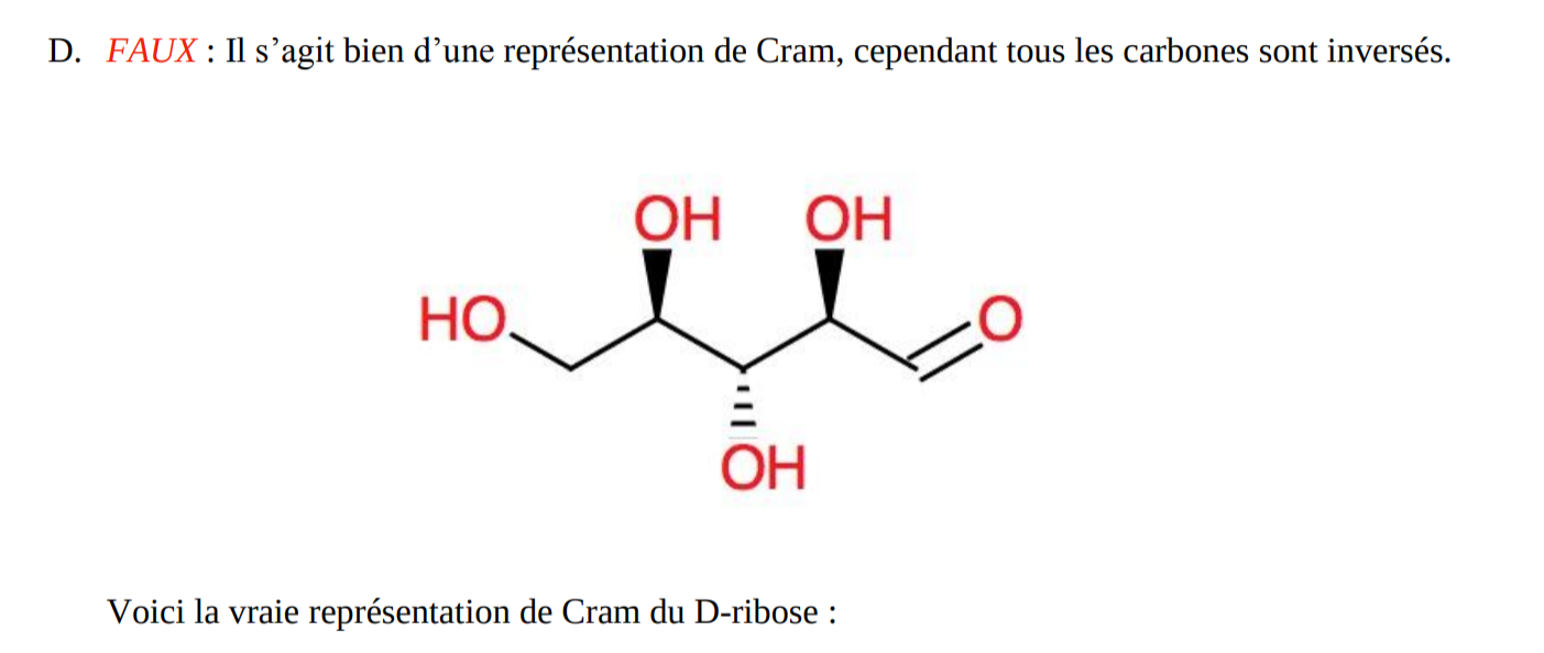 Kinetochore Posted October 28, 2019 Author Posted October 28, 2019 à l’instant, LanaBanana a dit : Salut @Kinetochore ! Dans la représentation de Cram les traits épais signifient que l'atome est dirigé vers l'avant et les traits en pointillés signifient que l'atome est vers l'arrière.  Dans la représentation de Fischer (celle qui est utilisé dans ton énoncé) tous les atomes présents sur une ligne horizontale sont vers l'avant.  Du coup ici, dans l'item D, les 2 OH qui sont vers l'arrière (parce que reliés par des pointillés) devrait être vers l'avant pour correspondre au D-ribose   Oui ça je l'avais compris mais du coup dans la correction y'a un OH qui est mis vers l'arrière alors que je les aurais tous mis vers l'avant...(je te mets la photo) Quote