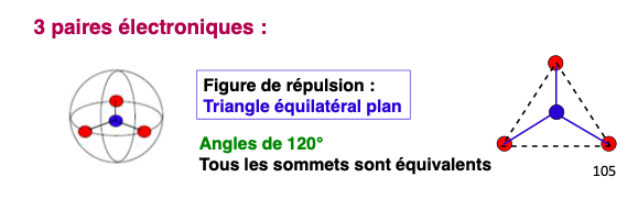 Solution maech Posted October 30, 2019 Solution Posted October 30, 2019 Dans ton cours tu as la réponse, lorsque tu as 3 doublets électroniques non liants autour d'un atome ta figure de répulsion sera un triangle équilatéral plan. En espérant que ça puisse t'aider Quote