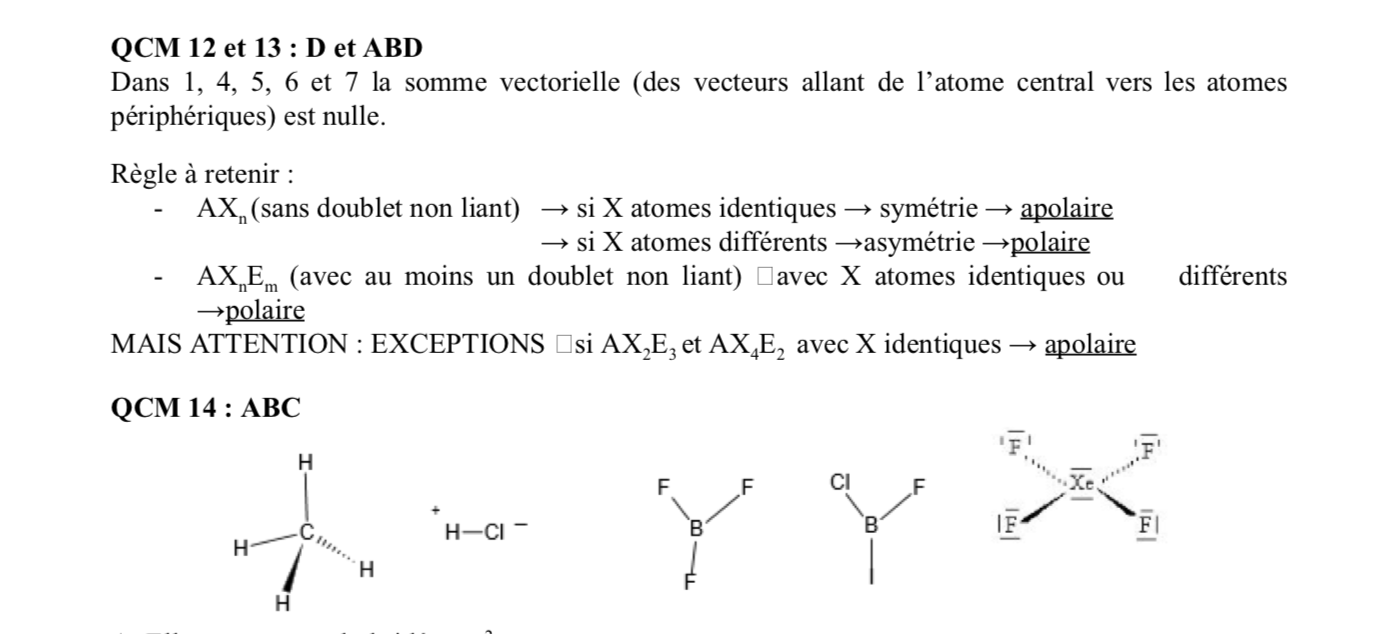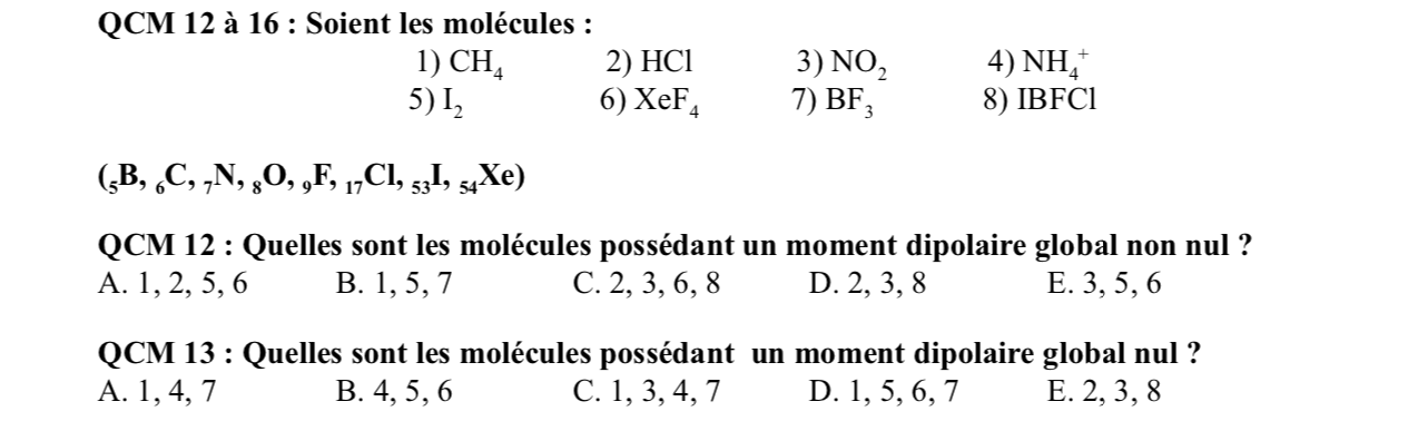 salut! je ne comprends pas pourquoi dans ce qcm il est écrit que la molécule 8 (IBFCl) a un moment dipolaire global non nul alors que quand on voit sa représentation dans le qcm 14 on voit bien que son moment dipolaire est nul (sachant qu'en plus elle est AX3)