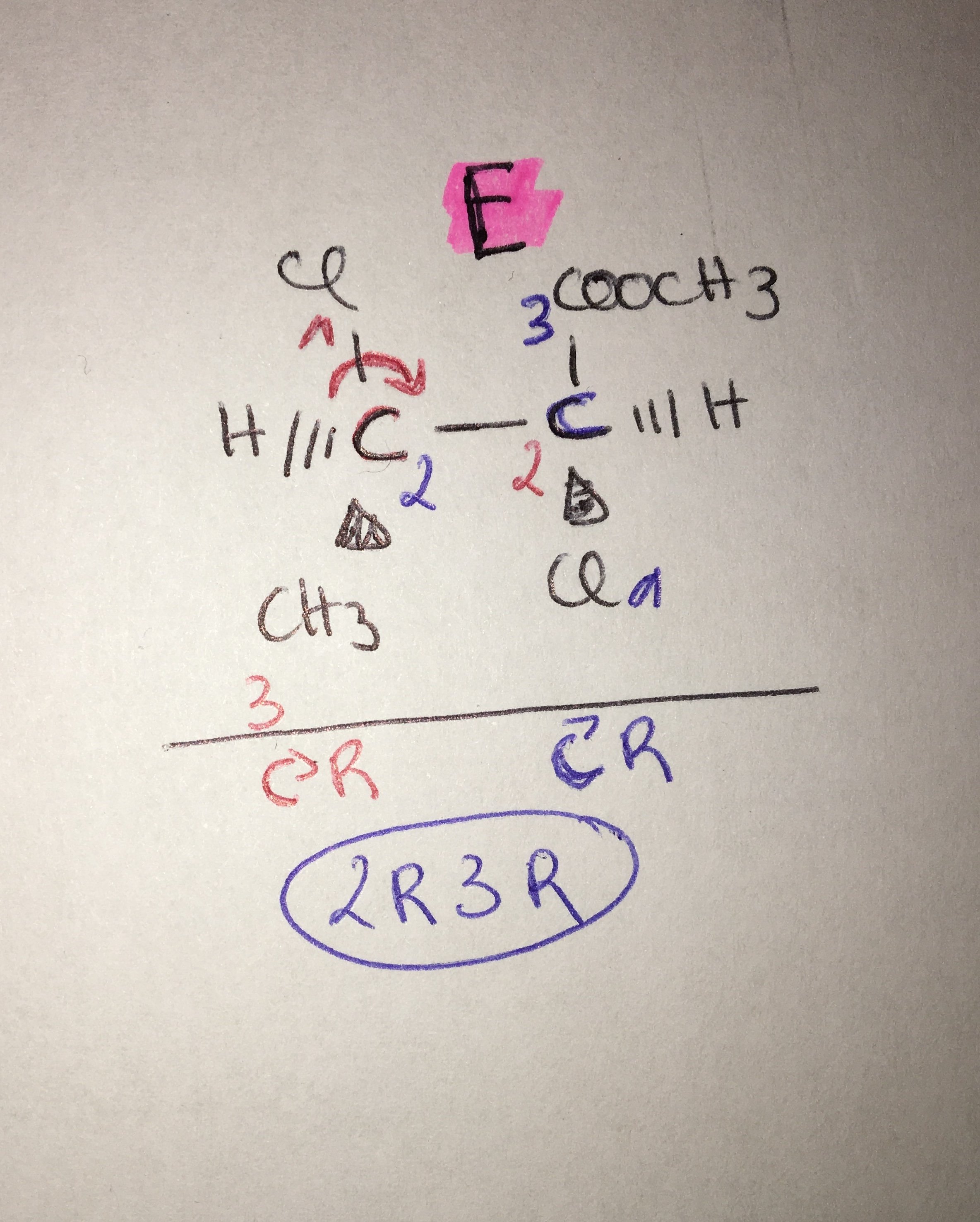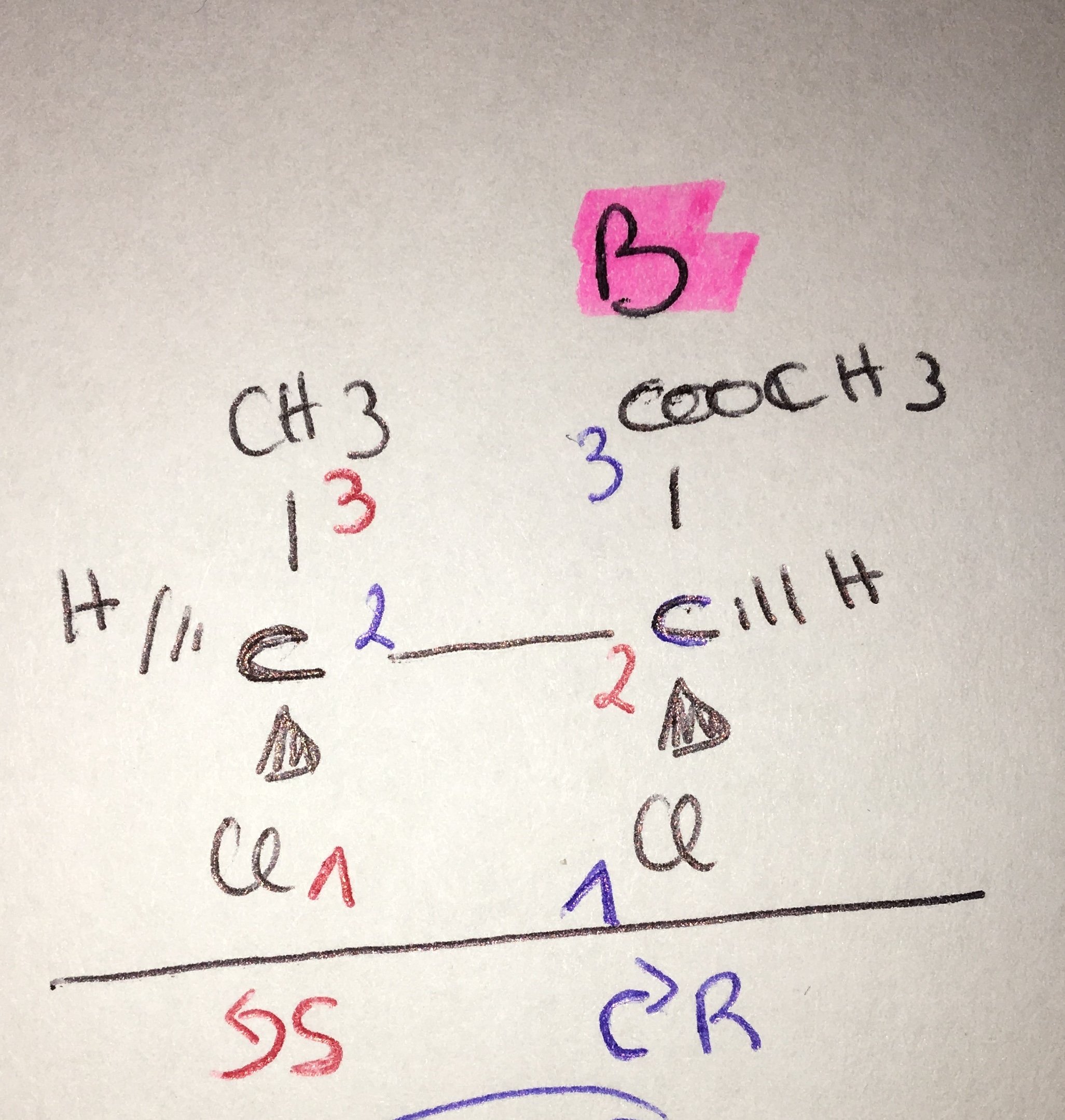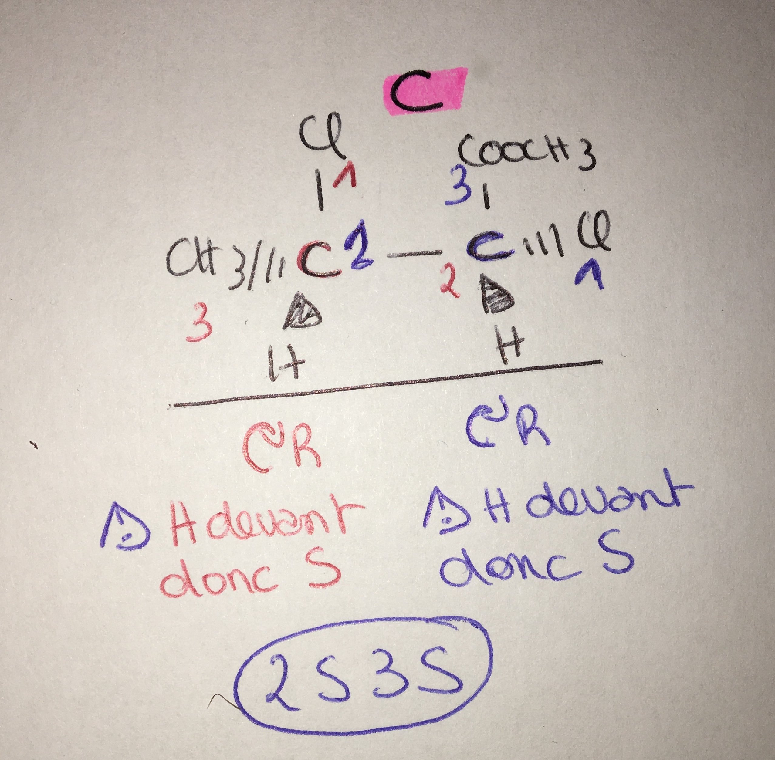 Luna2703 Posted November 12, 2019 Posted November 12, 2019 Voilà en détails pour la C et E. Pour la B c'est le même principe mais n'oublie pas la numérotation des carbones : la fonction ester est prioritaire donc le C lié à COOCH3 est numéro 2 et le C suivant numéro 3 d'où 2R3S. En espérant que ça t'aide. Quote