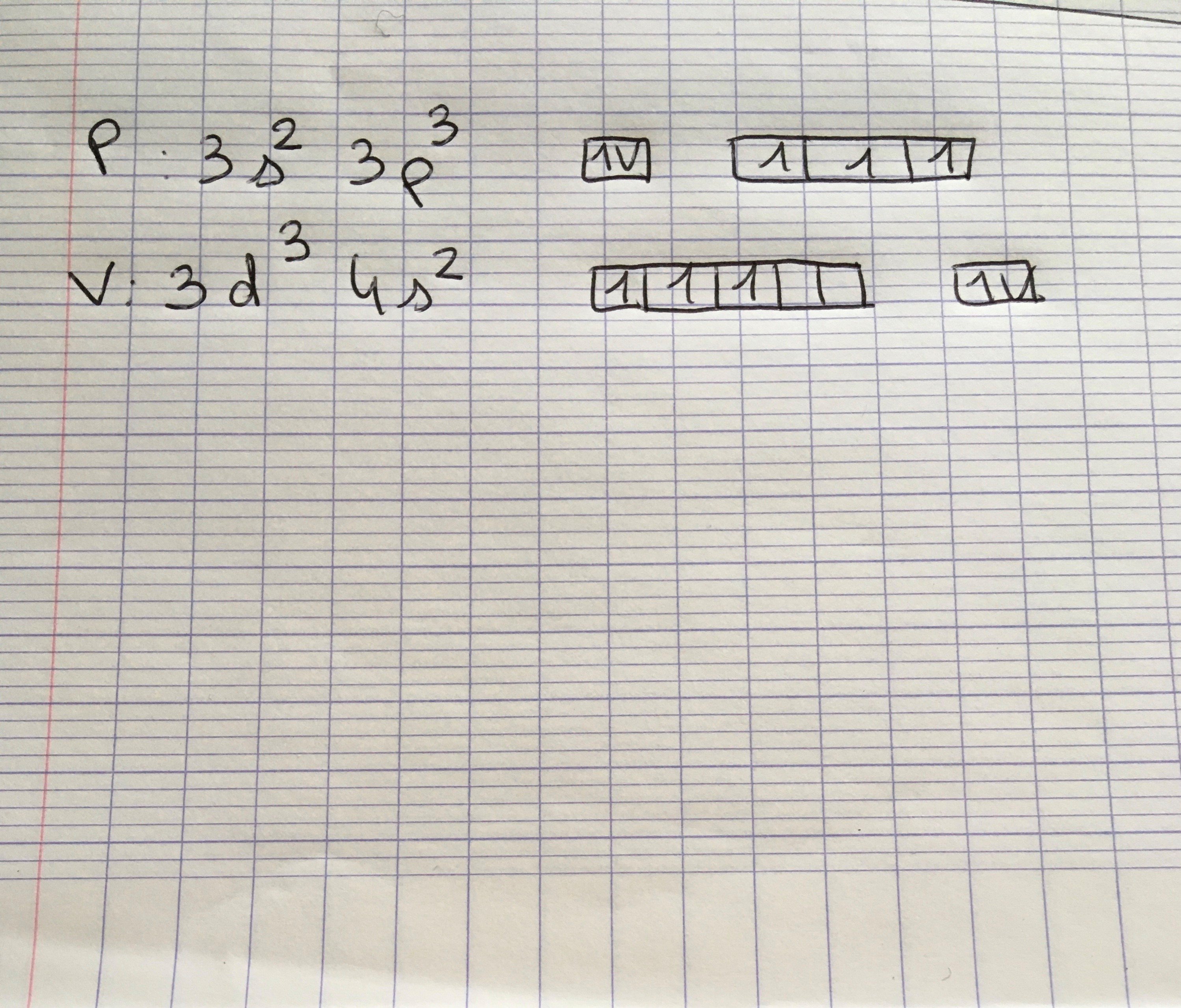 Emmacoste Posted November 14, 2019 Posted November 14, 2019 Coucou effectivement ce n'est pas dur mais c'est un coup à prendre ! Tout d'abord il te faut situer tes 2 éléments dans ton tableau c'est hyper important une fois que c'est fait tu regardes tes dernières couches car c'est la que se trouve tes électrons célibataires. On obtient alors P : 3s2 3p3 donc 3 électrons célibataires et V : 3d3 4s2 3 électrons célibataires aussi. Ce qui a pu te tromper aussi c'est la règle de Hund est ce que tu l'as bien respecté ? Tu dois bien répartir les électrons directement dans les orbitales et pas les remplir une par une comme ça : Quote