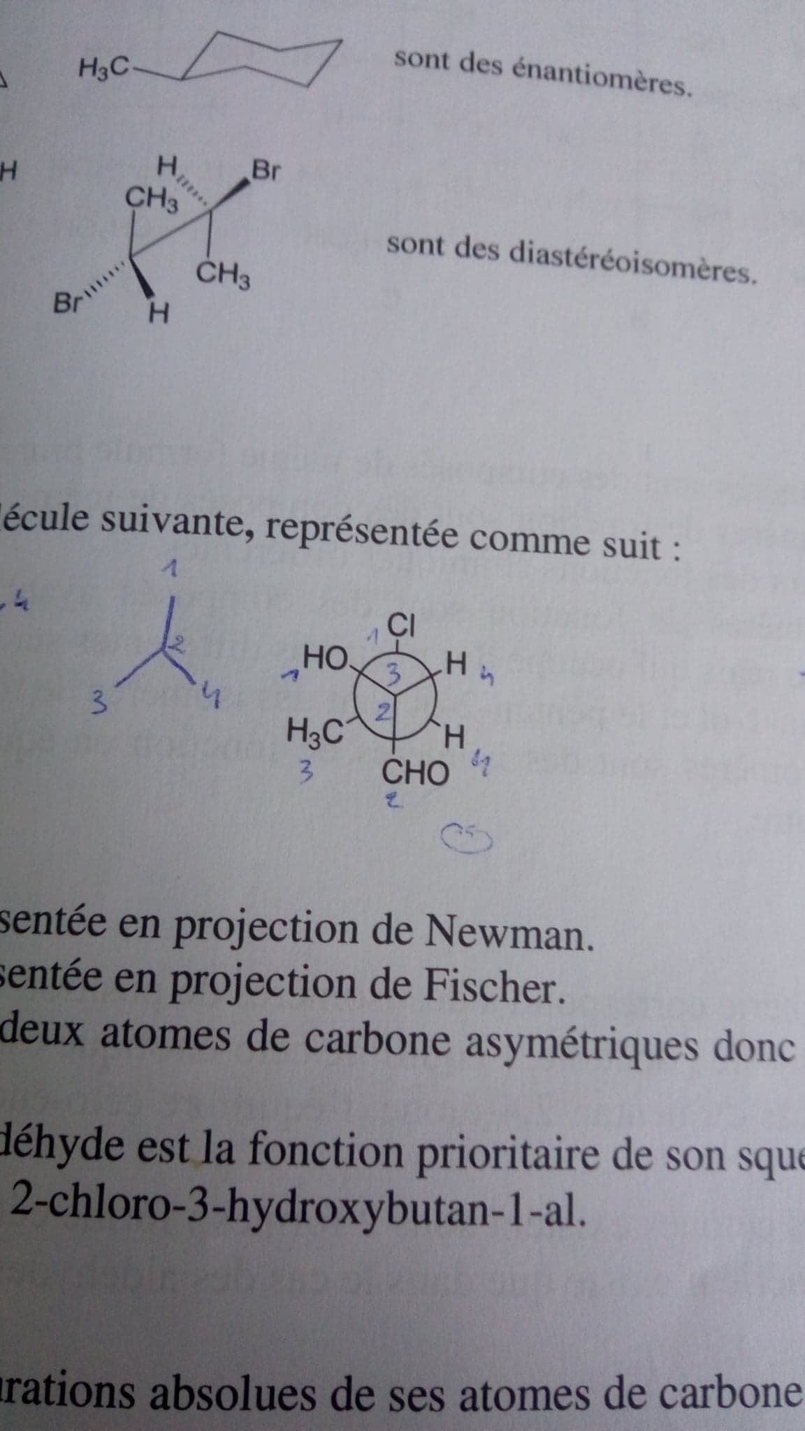 DrR Posted November 24, 2019 Posted November 24, 2019 il y a 2 minutes, Depsined a dit : Up, aidez moi svp, je sais que c'est tout bĂȘte en plus hey, essaie de faire tourner la newman de sorte Ă avoir les carbones en haut pour les deux carbones asymĂ©triques, ensuite tu trace au crayon par dessus, la chaine carbonĂ©es la plus longue (en trait plein et poitillĂ©s pr celui de derriere). Ensuite tu numĂ©rote avec le C le plus oxydĂ© en premier, tu peux ensuite passer en fischer avec le cho en haut et ch3 en bas, tu mets tes groupements sur les cĂŽtĂ©s et voila tu peux numĂ©roter et lire les configurations en oubliant pas que la chaine carbonĂ©es et en arriĂšre Ă l'inverse des groupements horizontaux Quote