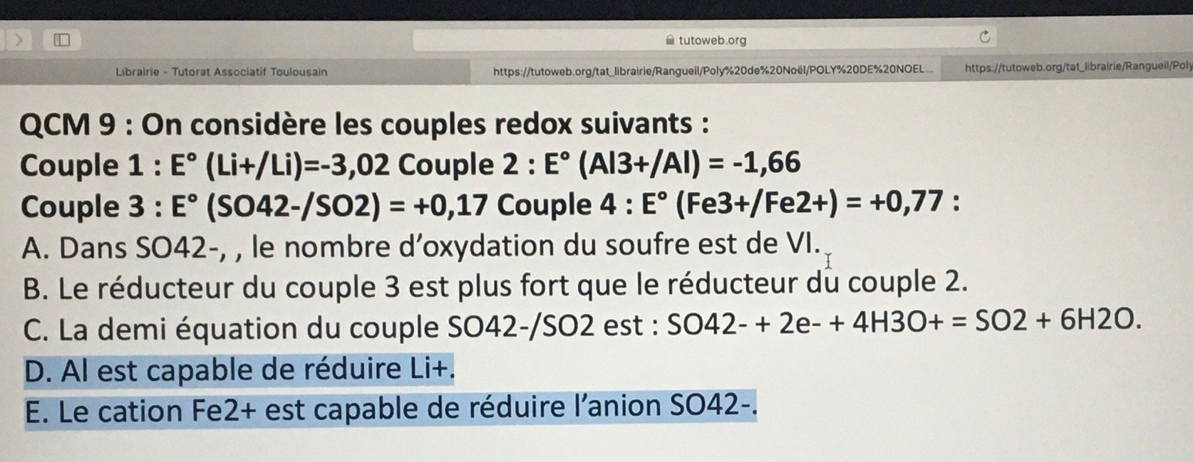 Ancien Responsable Matière Alexcipient Posted December 12, 2019 Ancien Responsable Matière Posted December 12, 2019 Salut @medecine_02! Alors pour répondre aux items D et E, il faut avoir en tête les règles suivantes : -un oxydant est d'autant plus fort que son potentiel standard est élevé. -Un réducteur est d'autant plus fort que son potentiel standard est faible. -Une réaction d'oxydo-réduction a lieu entre l'oxydant le plus fort et le réducteur le plus fort. Pour la D : Quand on compare donc le premier couple, on se rend compte que le couple Li+/Li a le potentiel standard le plus faible et Al3+/Al a le potentiel standard le plus fort. Donc Al3+ est l'oxydant fort et Li est le réducteur fort. Donc je dirais à priori que ceci est un erratum puisque la D est censée être fausse. C'est Li qui doit réduire Al3+ Voilà je te laisse faire pour la E et tu me dis si tu n'as pas compris Quote
