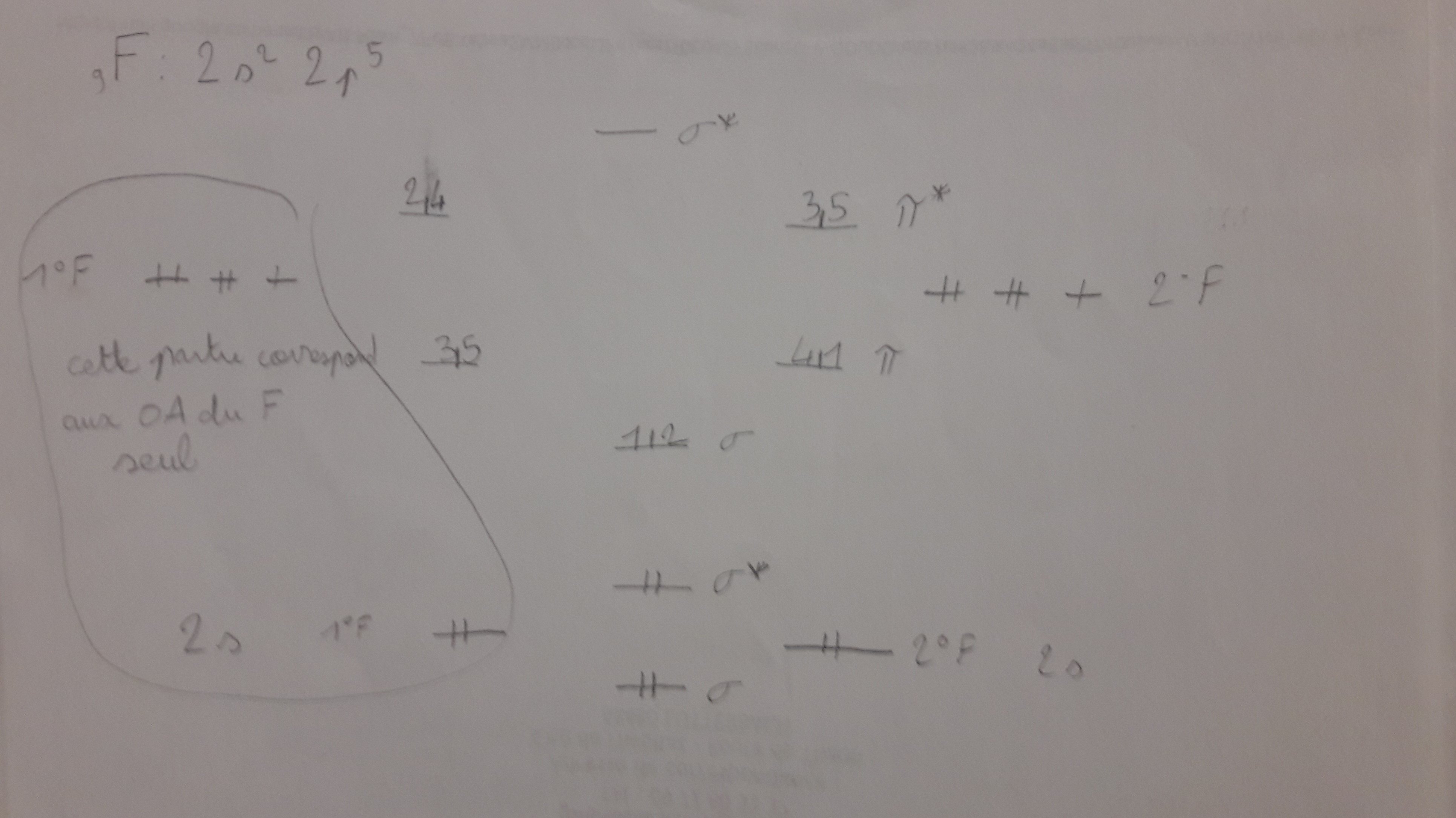 Ancien Responsable Matière Solution Alexcipient Posted December 13, 2019 Ancien Responsable Matière Solution Posted December 13, 2019 Salut @Clover! Alors tout d'abord prenons l'exemple de la molécule F2. Il faut commencer par déterminer la configuration électronique externe : 2s2 2p5. Je t'ai fait un dessin pour t'expliquer un peu. La partie que j'ai entourée correspond aux orbitales atomiques du fluor isolé (comme tu l'aurais faite normalement). Tu ne représentes sur le diagramme uniquement la couche de valence. Ensuite, il faut savoir que les OM respectent les trois règles suivantes : -Principe de stabilité -Règle de Hund -Principe d'exclusion de Pauli Du coup, j'ai fait figurer les électrons par des numéros, ça correspond à l'ordre dans lequel on remplit le diagramme. Typiquement, les traits étant sur la même ligne possède la même énergie (c'est pour ça qu'on remplit d'abord les lignes les plus basses), puis on respecte la règle de Hund (ce qui explique qu'on ne mette pas les 2 électrons directement sur le même trait). Et j'ai rempli les 5 électrons du premier fluor, puis les 5 électrons du 2ème (ceux appartenant à la sous-couche 2p) Voilà j'espère que ça te permets de voir un peu mieux comment on fait Quote