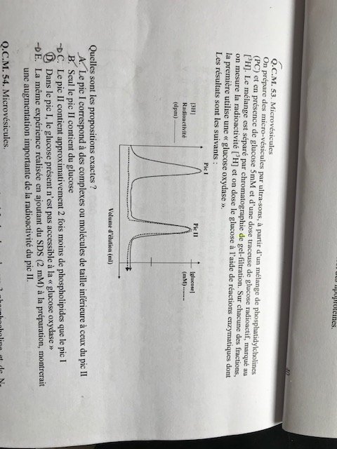 Ancien Responsable Matière Solution ValentineMartel Posted December 24, 2019 Ancien Responsable Matière Solution Posted December 24, 2019 Coucou, On te parle de 3 éléments différents : - Du glucose non radioactif - Du glucose radioactif - Des microvésicules Le glucose total va être sous deux formes distinctes : libre ou à l'intérieur des vésicules. S'il est élué sous forme libre (radioactif ou non radioactif), il sera substrat de la glucose oxydase (pic en pointillé), s'il est élué à l'intérieur des vésicules, la glucose oxydase ne pourra pas l'atteindre (et il n'y aura pas de pic en pointillé). Pour le glucose radioactif, qu'il soit élué sous forme libre ou à l'intérieur des vésicules, on trouvera un signal radioactif (pic en trait plein). Sur le schéma on voit deux pics, on en conclut donc qu'il y a deux élutions distinctes. L'item A est faux car comme tu le sais, lors d'une chromatographie gel-filtration, ce qui est élué en premier est ce qui est plus gros. Donc le pic I correspond à des complexes ou molécules de taille supérieure à ceux du pic I. L'item B est faux car on voit que le pic I nous donne un signal radioactif. Il y a donc bien du glucose à l'intérieur. On devine que le pic I correspond aux microvésicules puisque la glucose oxydase n'a pas accès au glucose (pas de pic en pointillé). L'item C est faux parce que dans le pic II il n'y a pas du tout de phospholipides car les microvésicules ont été éluées dans le pic I. L'item D est vrai, comme expliqué plus haut. L'item E est vrai. Le SDS aurait dénaturé complètement les microvésicules, donc tout le glucose aurait été libre et élué dans le pic II. On aurait donc bien eu une augmentation du signal radioactif à ce niveau. Voilà Quote
