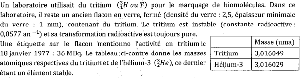 Il faut déjà remarquer que le tritium se transforme en hélium, donc augmente en numéro atomique (hydrogène Z = 1 ; hélium Z = 2) Cela correspond donc à une transformation β-, où un neutron devient un proton.