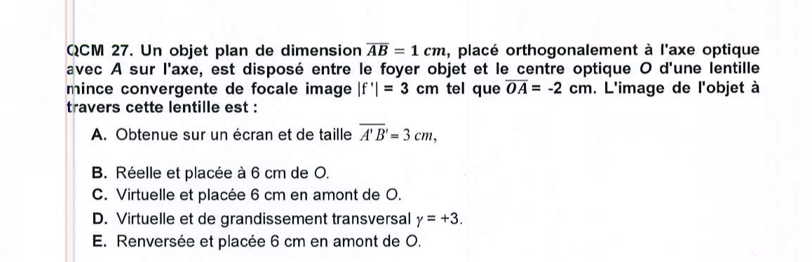 Thiasmine Posted January 4, 2020 Posted January 4, 2020 en effet, @lary-bambelle une image virtuelle n’est pas visualisable sur un écran, et comme OA’= -6 alors l’image est bien virtuelle (a gauche de O) donc on ne peut pas « l’obtenir sur un écran » comme le stipule l’item Quote