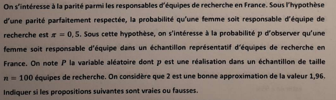 Ancien Responsable Matière Lénouillette Posted January 5, 2020 Ancien Responsable Matière Posted January 5, 2020 Helloooooooo @Mazlo ! il y a 20 minutes, Mazlo a dit : Je ne comprends pas pourquoi on cherche P et pas p (puisqu'on part bien d'une valeur théorique pi et qu'on construit un intervalle de pari ? Et p, ce n'est pas la valeur qui nous intéresse et qu'on cherche à estimer ?) Quel est la différence entre p et P ? P, c'est la variable aléatoire qui va être un peu comme la synthèse de p (qui est une réalisation), P est la probabilité attendue. il y a 24 minutes, Mazlo a dit : Ensuite, je ne comprends pas pourquoi l'item B est faux (est-ce que c'est parce qu'en faisant un IP à partir de la valeur théorique, on a pas besoin d'échantillon et donc, du TCL ?) Et donc, il est faux parce que la probabilité attendue est P, et non p. Quote