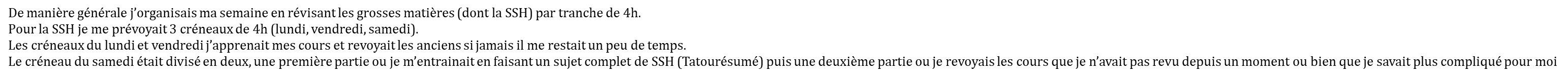 Ancien Responsable Matière Ambre22 Posted January 29, 2020 Ancien Responsable Matière Posted January 29, 2020 Bonsoir, Apprendre les plans du cours te permettra de structurer tes connaissances et de savoir ou piocher le jour du concours en voyant ce qu'on te demande à la question 3 Il est important de connaitre les notions du cours ainsi que les mots clés (car c'est ça qu'on vous demande de restituer) après pas besoin d'apprendre "mot pour mot" mais il faut réussir à dégager les notions importante du cours! Il vaut mieux en dire trop que pas assez je pense, et personnellement j'apprenais mes cours par cœur (ça demande bcp de temps mais c'est vraiment rentable niveau coefficient) voici ma méthode pour l'apprentissage pendant les cours : de manière générale j'organisais ma semaine en révisant les grosses matières par créneau de 4h Pour la SSH je me prévoyait 3 créneaux de 4h dans la semaine (lundi, vendredi et samedi) Les créneaux de lundi et vendredi j’apprenais les cours de la semaine et revoyait les ancien si j'avais du temps Le samedi je faisait un sujet de SSH en 1h30 puis je revoyait les cours ou j’avais le plus de mal Je pense qu'il te faut t'entrainer sur des sujets pour que tu cernes ce qui va t'être demandé Bonne soirée Quote