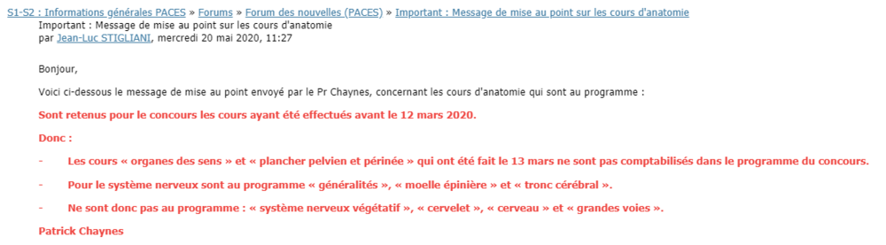 Axeldc Posted March 20, 2020 Posted March 20, 2020 Bonjour, Il y a 9 heures, Batwoman a dit : les cours du vendredi 13/03 même s'ils ont été dispensés matin/aprem ne seront pas pris en compte pour l'élaboration des sujets Suite à ce message, j'ai un dernier petit doute. Le vendredi 13 nous avons eu un cours d'UE8 Petit bassin avec la Pr CHANTALAT qui était un cours rattrapé qu'on aurait dû avoir un lundi une semaine plus tôt, ce cours étant normalement un lundi sera-t-il au programme ? Veuillez m'excuser si une information m'échappe, Bonne soirée