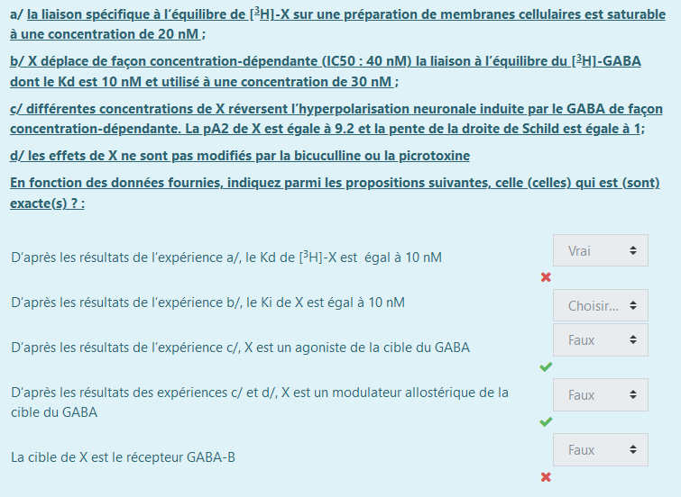 Solution Maïna Posted March 22, 2020 Solution Posted March 22, 2020 Effectivement, la bicuculline est un antagoniste du récepteur GABA-A. Si les effets de X ne sont pas modifiés par la bicuculline, il ne peut pas s'agir du GABA-A ! Quote