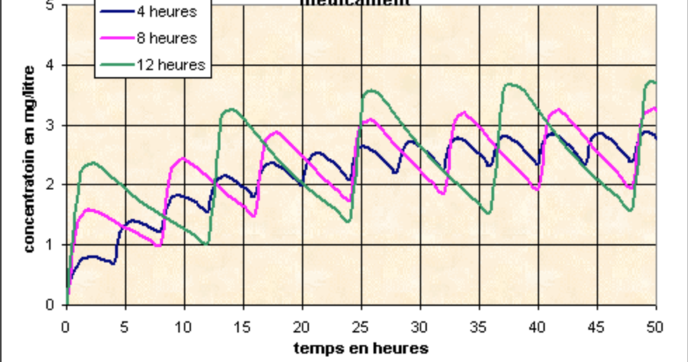 Solution Phosphatidylcholine Posted March 24, 2020 Solution Posted March 24, 2020 (edited) Salut! En fait quand tu administres la même dose en une seule fois, ton pic de concentration va monter plus haut que si tu administres 2x (à distance l'une de l'autre) la moitié de la dose. Au final tu as la même dose administrée dans la journée, mais dans le 2ème cas la concentration aura eu le temps de rediminuer entre les 2 administrations. Quand tu calculeras la fluctuation des concentrations (la concentration maximale divisée par la concentration minimale) tu te rendras alors compte que puisque la concentration maximale est plus faible avec l'administration de plusieurs petites doses, la fluctuation sera elle aussi moindre. Je te mets une illustration que j'ai trouvé sur internet pour t'expliquer: Plus tu augmentes le nombre de prises pour la même dose totale, plus chaque dose sera petite: ici la même dose est répartie en soit 6 injections (toutes les 4h), soit en 3 injections (toutes les 8h) soit en 2 injections (toutes les 12h) par jour; on voit que la différence entre les pics et les vallées pour les injections plus répétées (courbe bleue) est plus petite que pour l'administration de la même dose en moins d'injections (courbe verte). Cela représente ta fluctuation des concentrations qui est donc inférieure lorsque tu répartis en un plus grand nombre de prises ta dose (comme dans ton énoncé: 2 prises au lieu d'une). Voilà j'espère que ça t'aide! Bon courage Edited March 24, 2020 by Phosphatidylcholine Quote