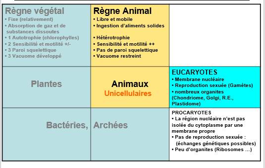 Solution MOZA Posted March 27, 2020 Solution Posted March 27, 2020 il y a 2 minutes, mathilde06 a dit : Salut ! Pour la case "eucaryotes" : je ne comprends pas prk il parle de plastidome : la def que je trouve sur internet est = Ensemble des plastes : les organites exclusifs de la cellule végétale. Or nous parlons du règne animal et pas végétal ! merci! bonjour non effectivement dans cette case D EUCARYOTES , il donne les caractères généraux des eucaryotes ( Animal et végétal ) et après il a détaillé les deux règnes végétal et animal, le tableau est mal fait Quote