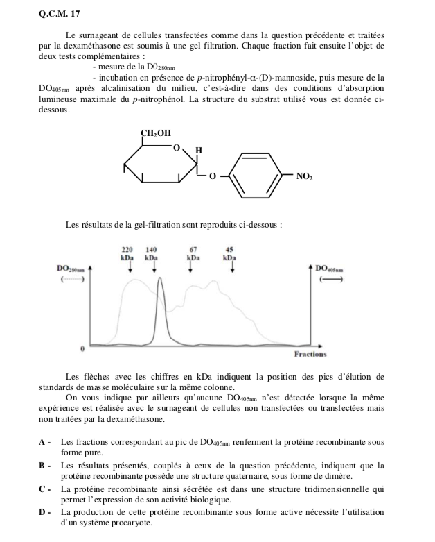 Celina Posted March 31, 2020 Posted March 31, 2020 Pour ce type de QCM ce qu'il faut garder en tête c'est la différence entre le gel filtration et Western Blot, donc le fait que le western Blot dénature et le gel filtration non, avec ça on peut en déduire les items B et C du QCM 17 B) En gel filtration les protéines ne sont pas dénaturés, on voit sur le graphe de la question que le PM est de 130kDa aprox., grâce au graphe de la question 16 on sait que notre protéine en WB (dénaturée) fait 63kDa, donc pour arriver a un poids de 130 --> 2 x 63 = 126kDa. L'item est donc du coup vrai la protéine rechercher est bien un dimere dans son structure quaternaire. C) Encore une fois la clef est la dénaturation --> gel filtration ne dénature pas et du coup une fois la protéine filtre elle pourra reprendre sont activité biologique , par contre dans un WB ce ne pas possible car la protéine dénature perd sont activité biologique A propos du P-nitrophenyl, petit résumé : Le pic obtenu dans le graphe est mesuré en DO donc on mesure l'absorbance, pour ceci il nous faut un molécule capable de absorber, les protéines normalement n'absorbent pas donc on ajoute une molécule a notre protéine d'intérêt capable d'absorber pour pouvoir la suivre, normalement molécules avec une résonance comme le p-nitro par example. En gros cette molécule nous permets de suivre grâce a son absorbance l'élution de notre protéine d'intérêt, elle est utilise comme marqueur et nous permets de dresser le graphique d'élution des protéines que te servira a déduire les qcm B et C . J'espere que ça pourra t'aider. Bon courage Quote