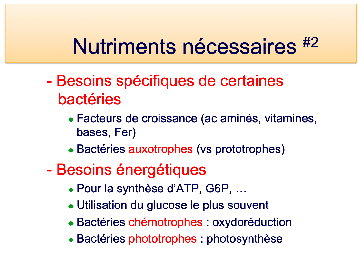 Ainsi les bactéries autotrophes ont des besoins spécifiques, le CO2 ne suffit pas à leur développement, elles ont besoin des facteurs de croissance en plus.